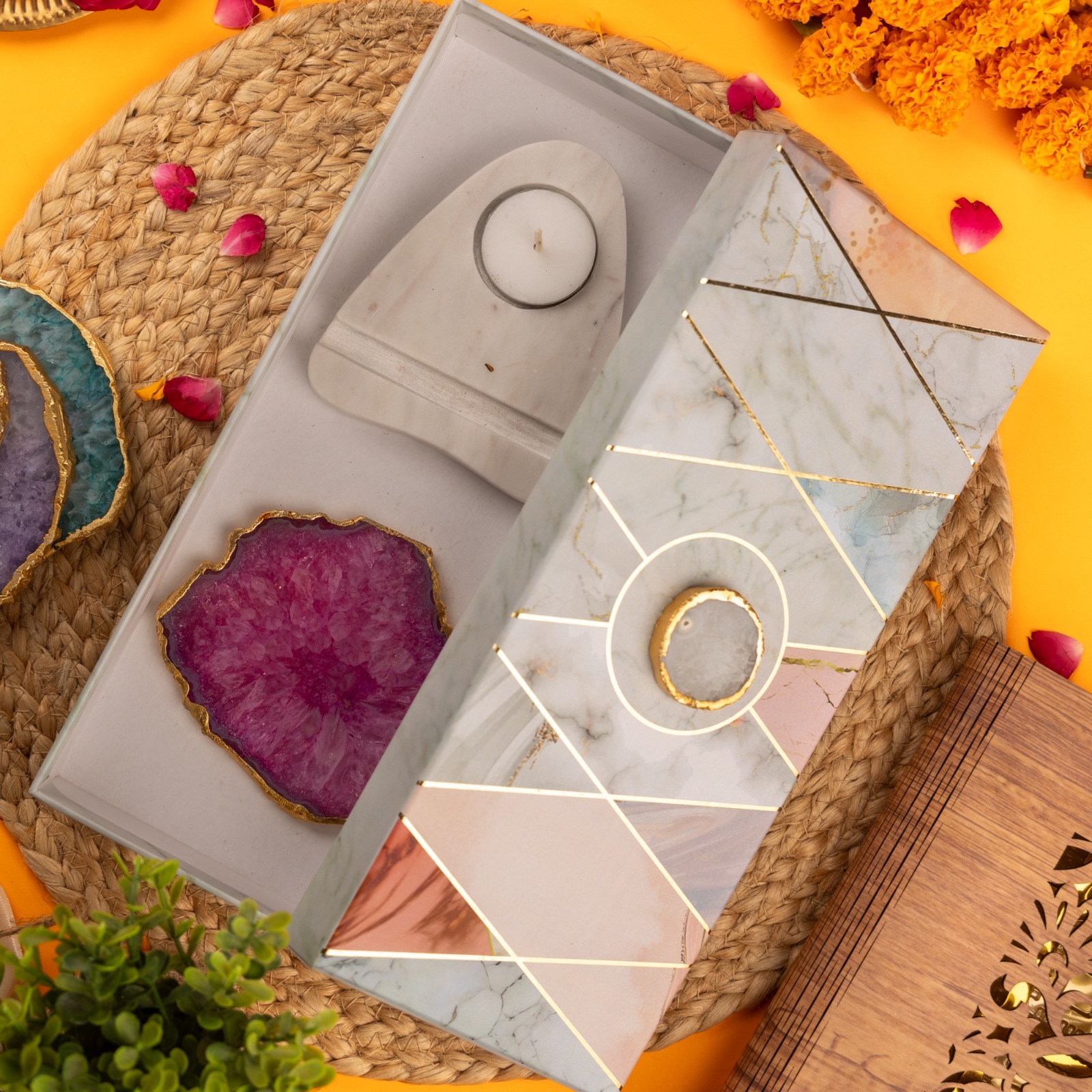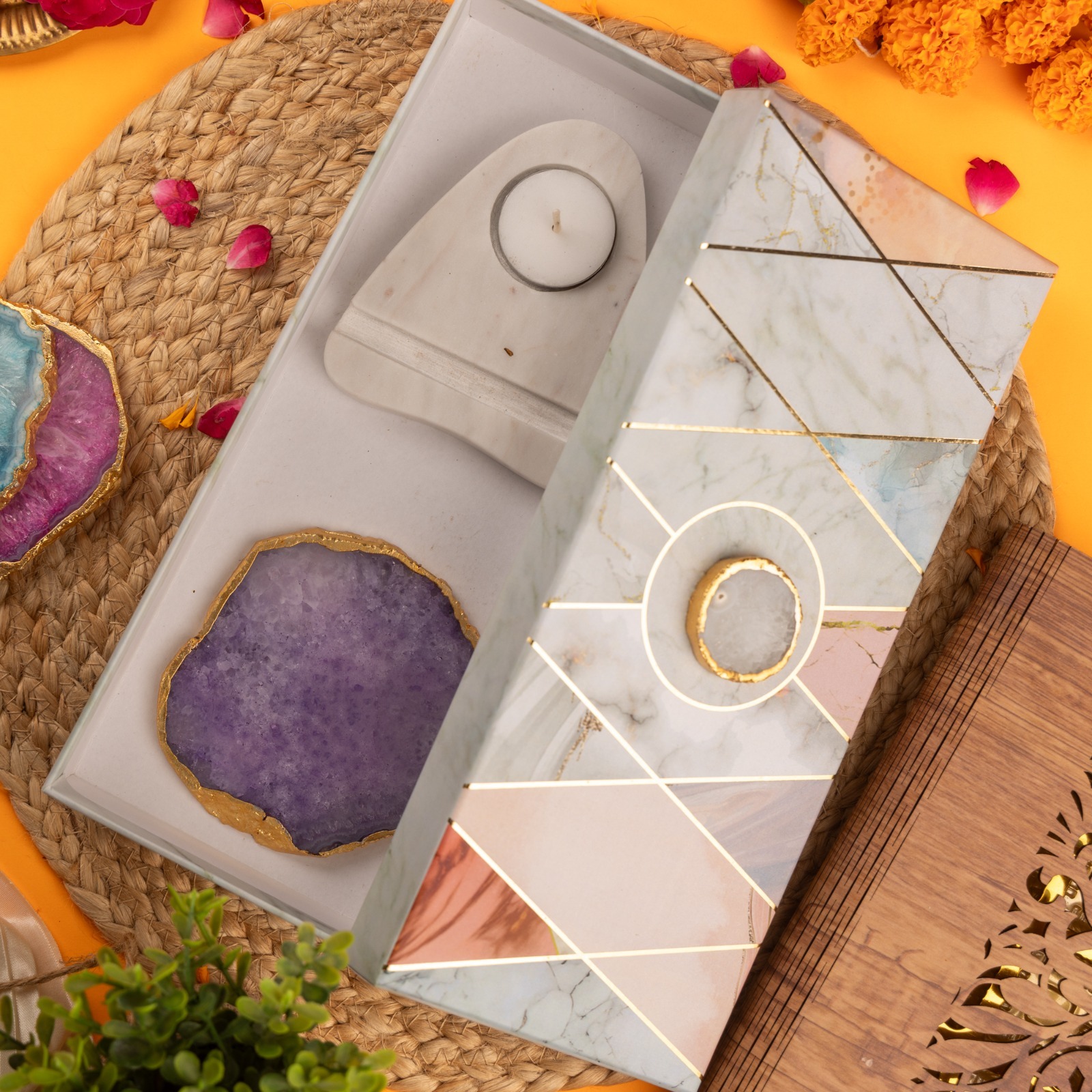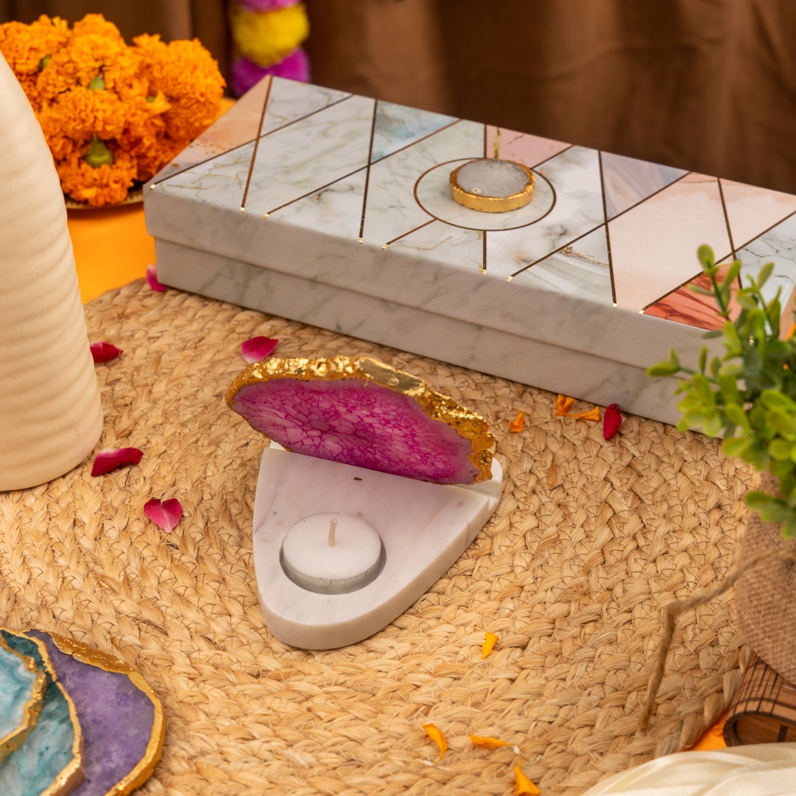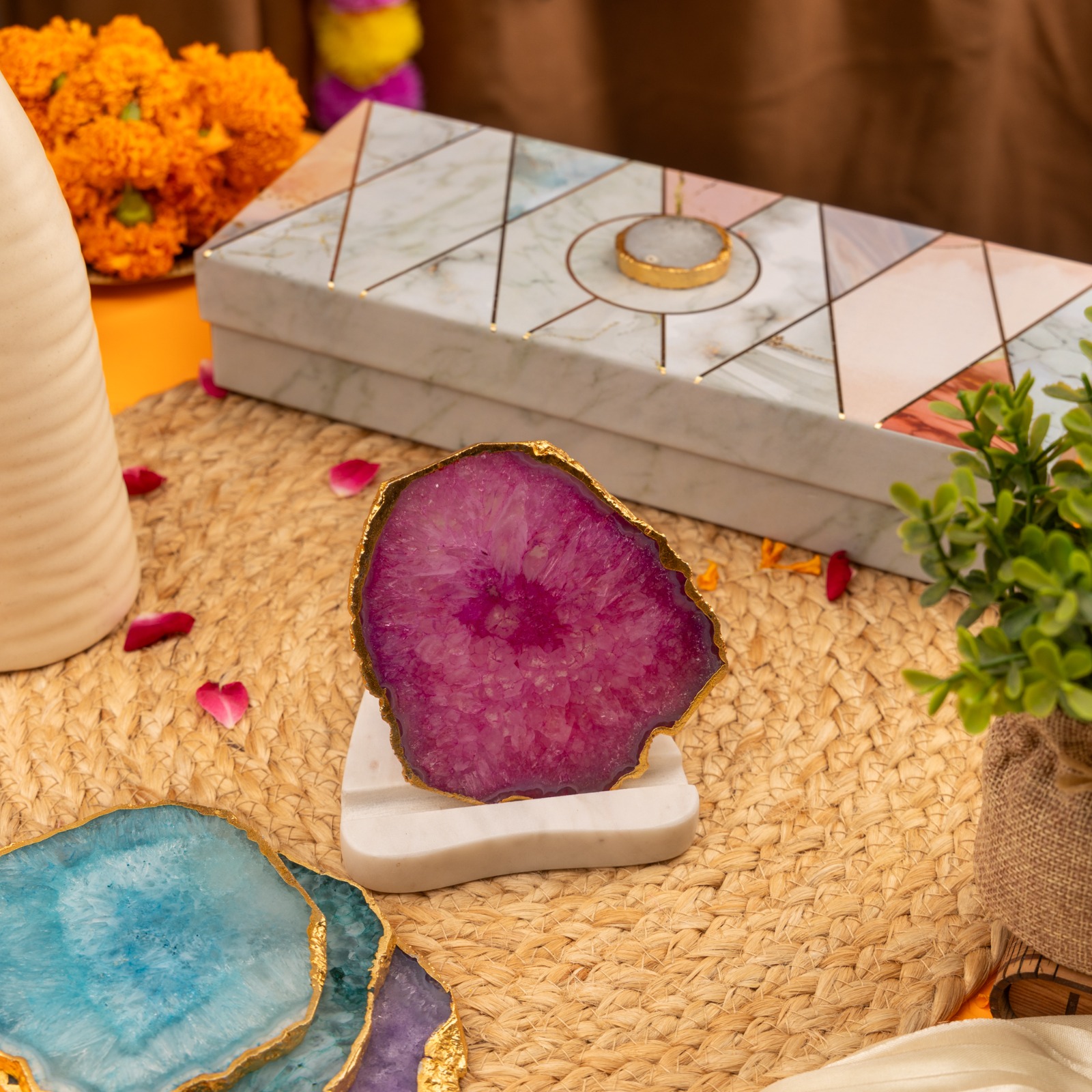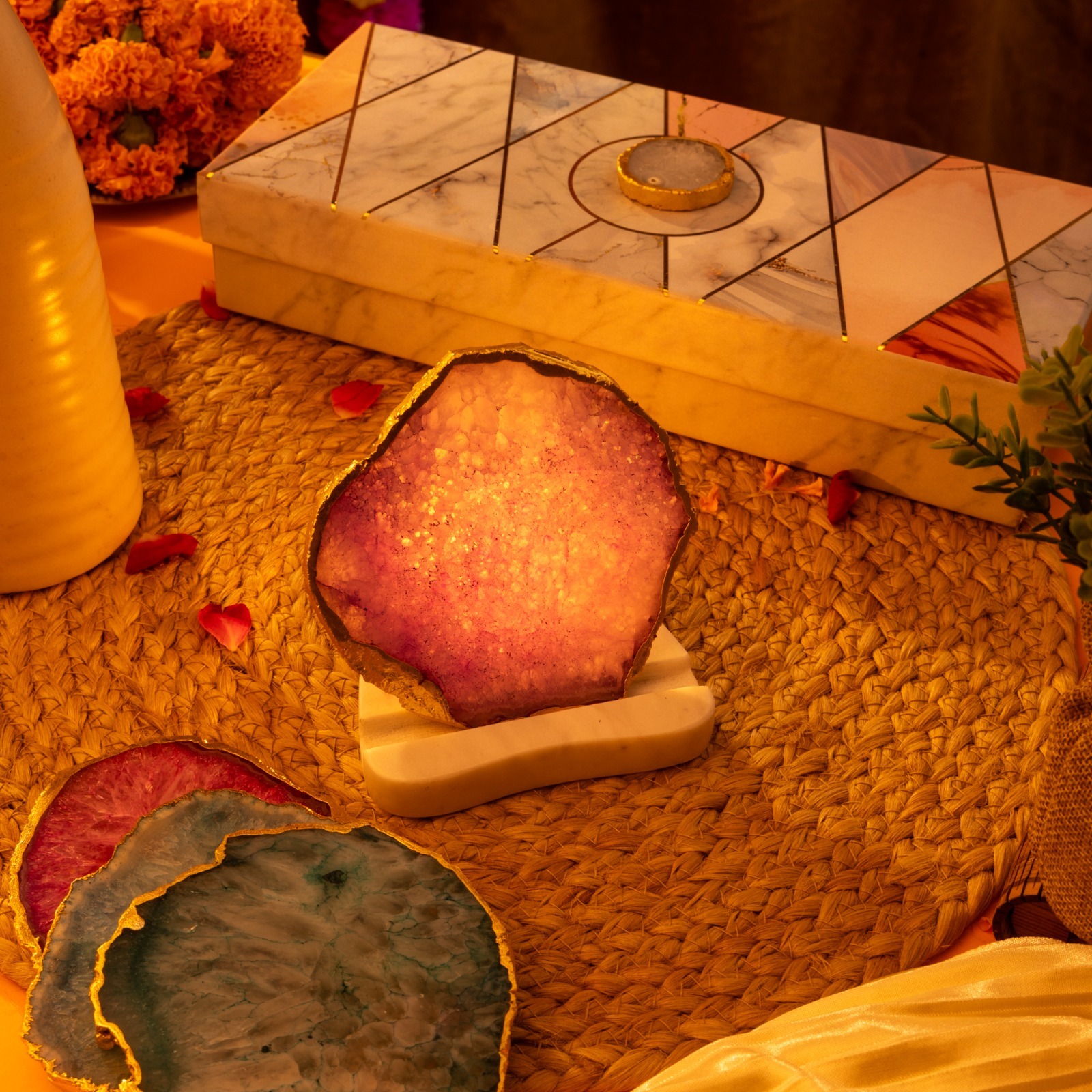 A unique combination to give ur home space a brighter and positive ambience with marble base and agate with gold platted edges plate( removable)