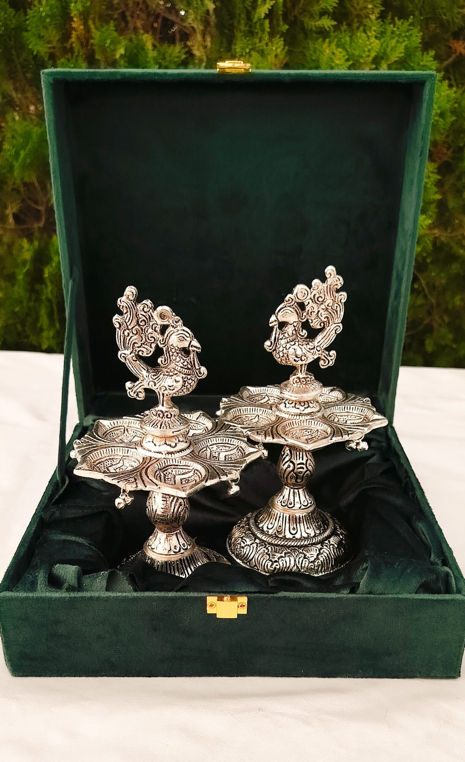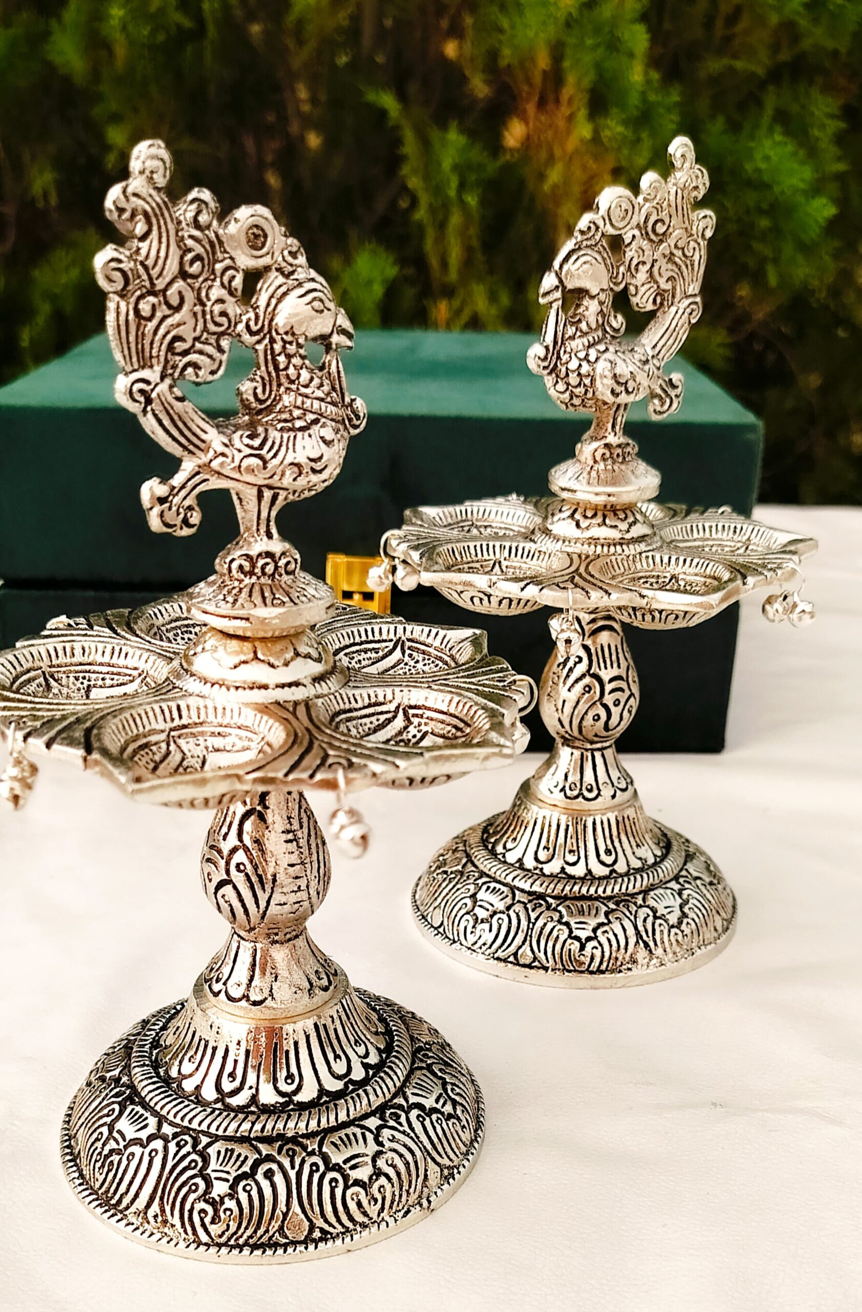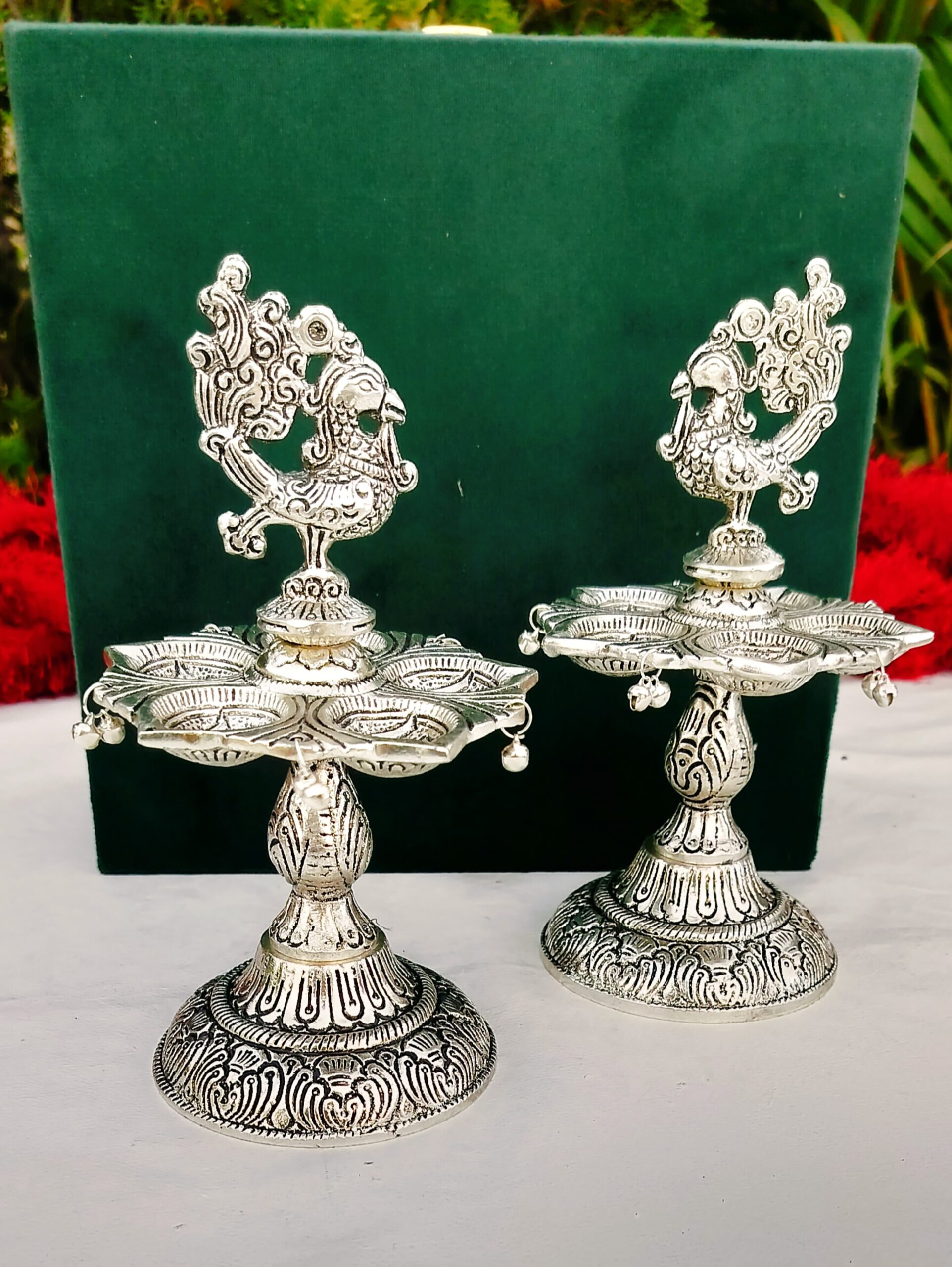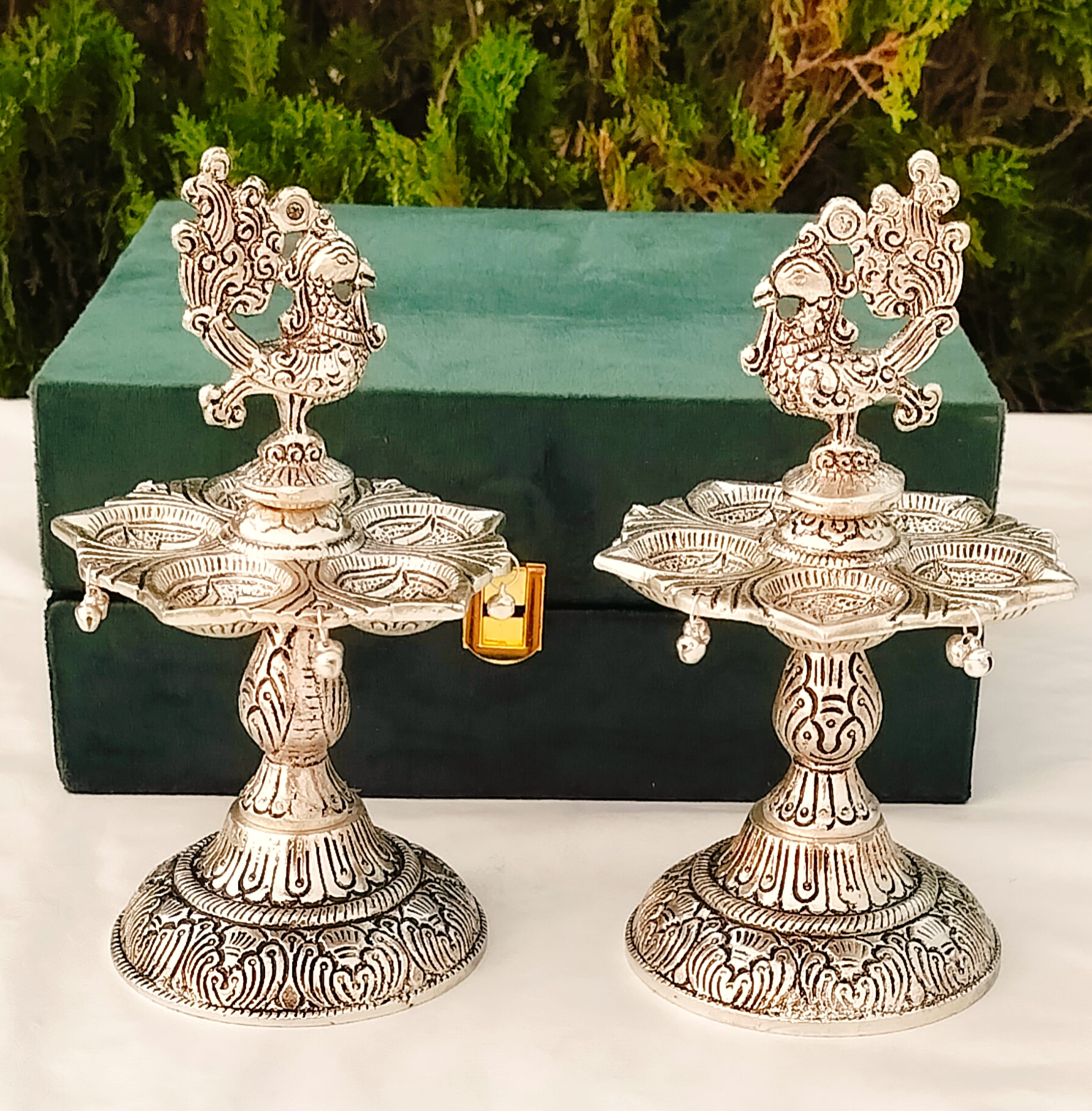 1. Pure silver antique finish peacock diya pair