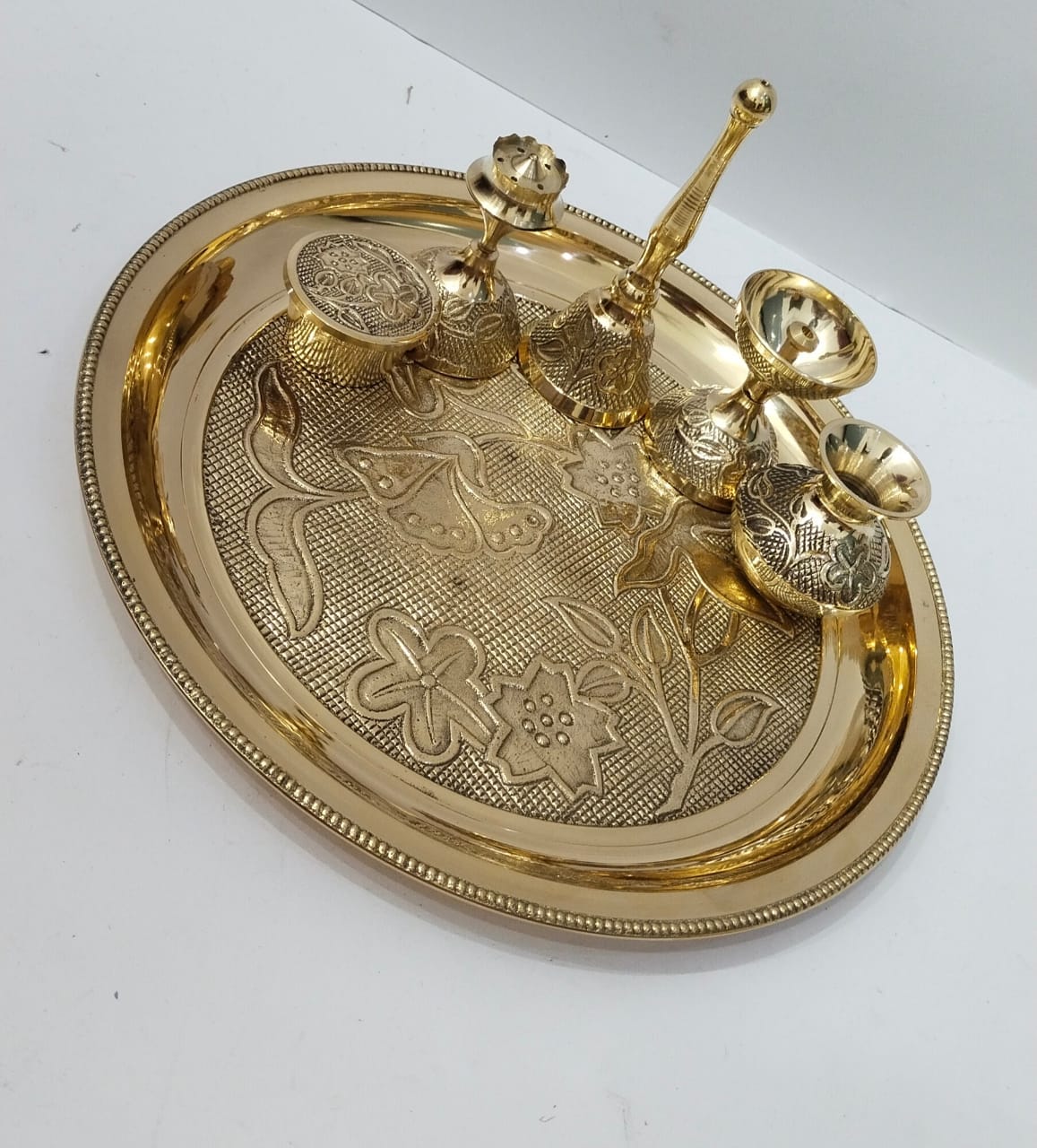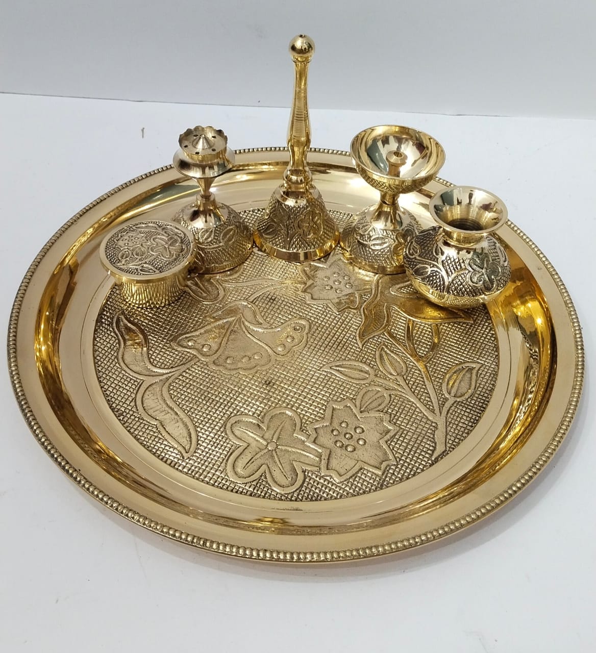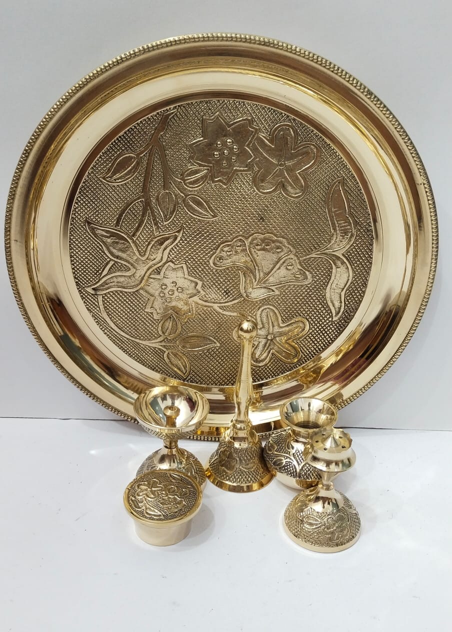 10″ thal + sindoor pot + agardan + ghanti + ghadha for holy water + jyoti