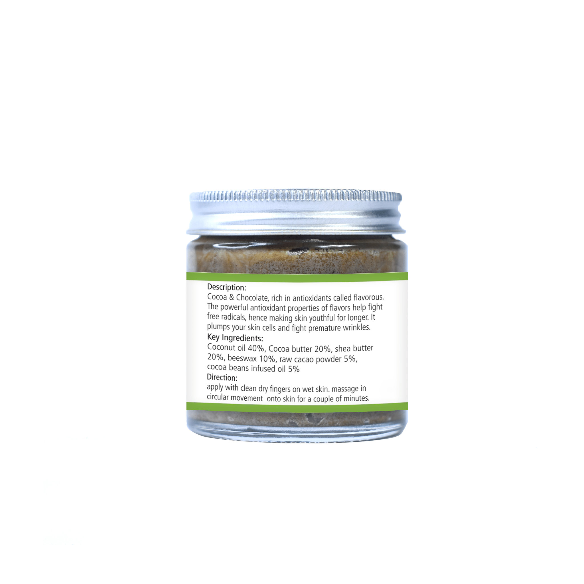 Our Cocoa and chocolate body butter is 100% natural and free from harmful chemicals such as SLS, parabens, palm oil, synthetic fragrances, GMOs, silicones, harsh detergents, and sulfates, making it safe and gentle for all skin types.