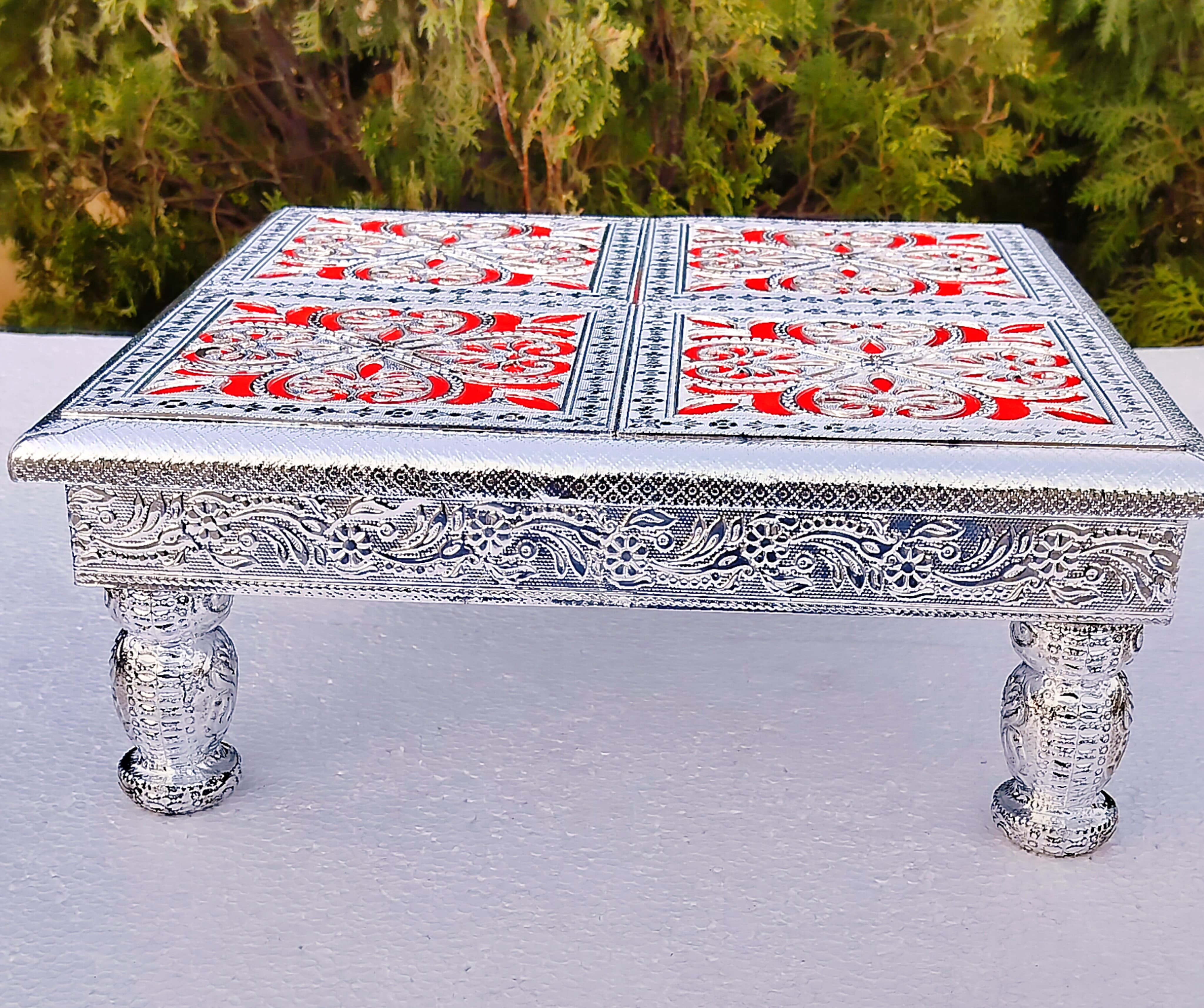 Pure German silver work on teak wood chowki with 4 Round German silver leg