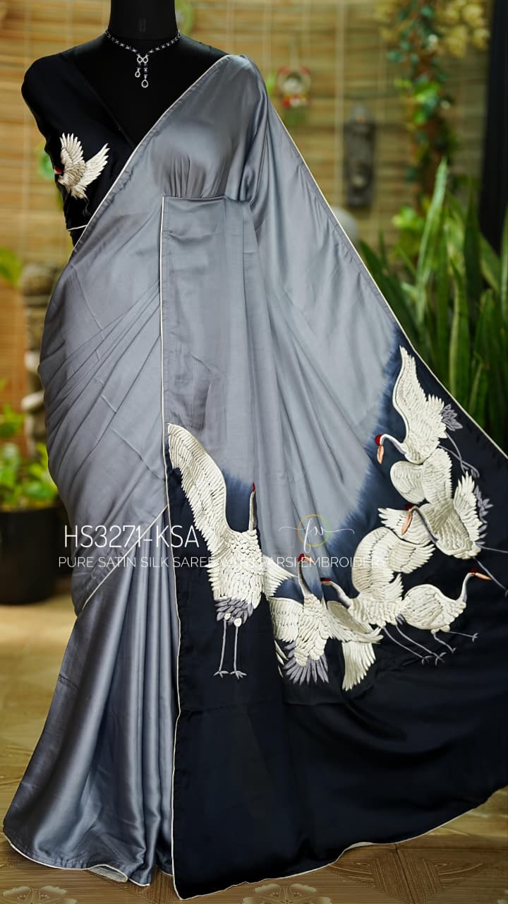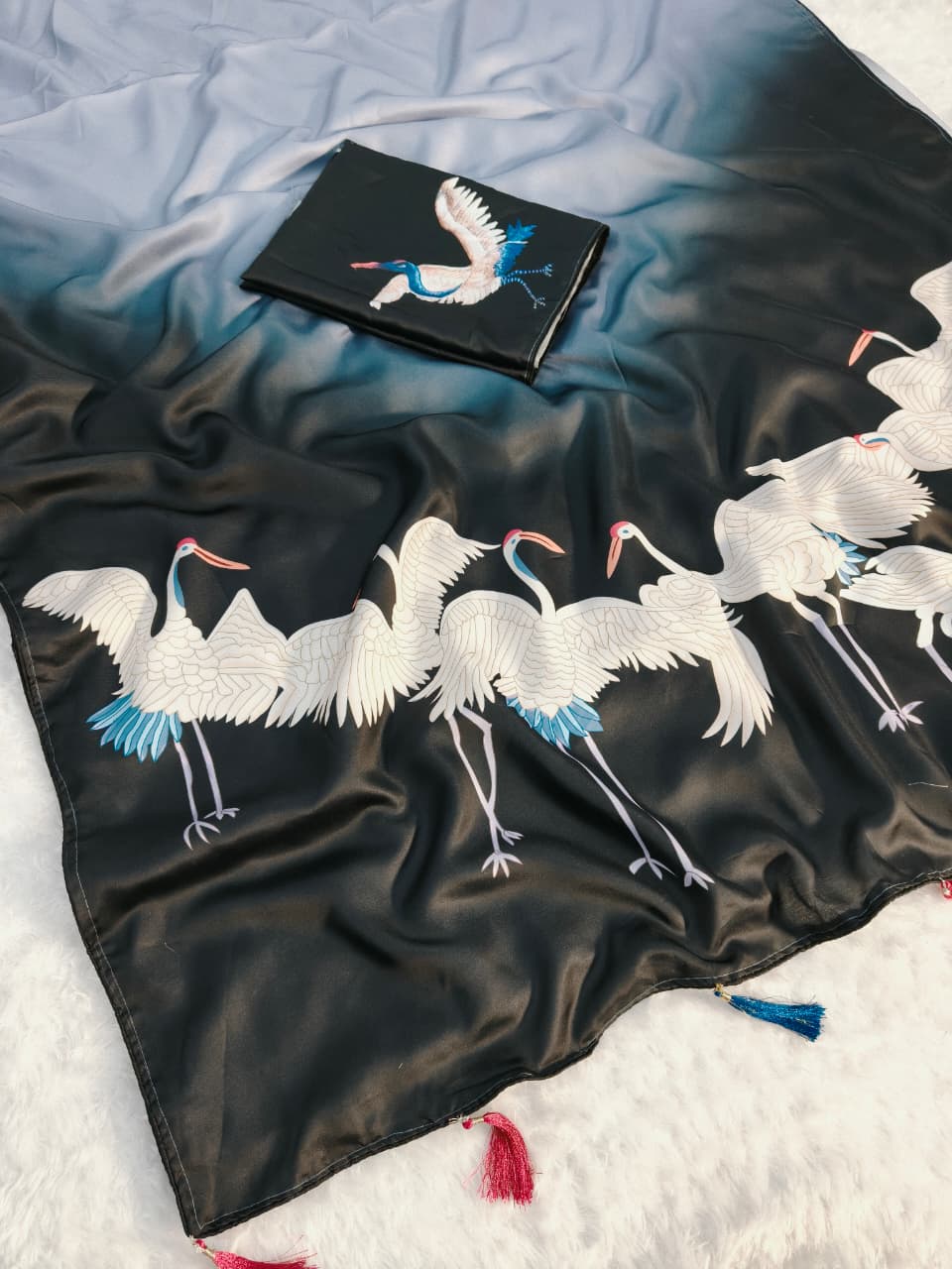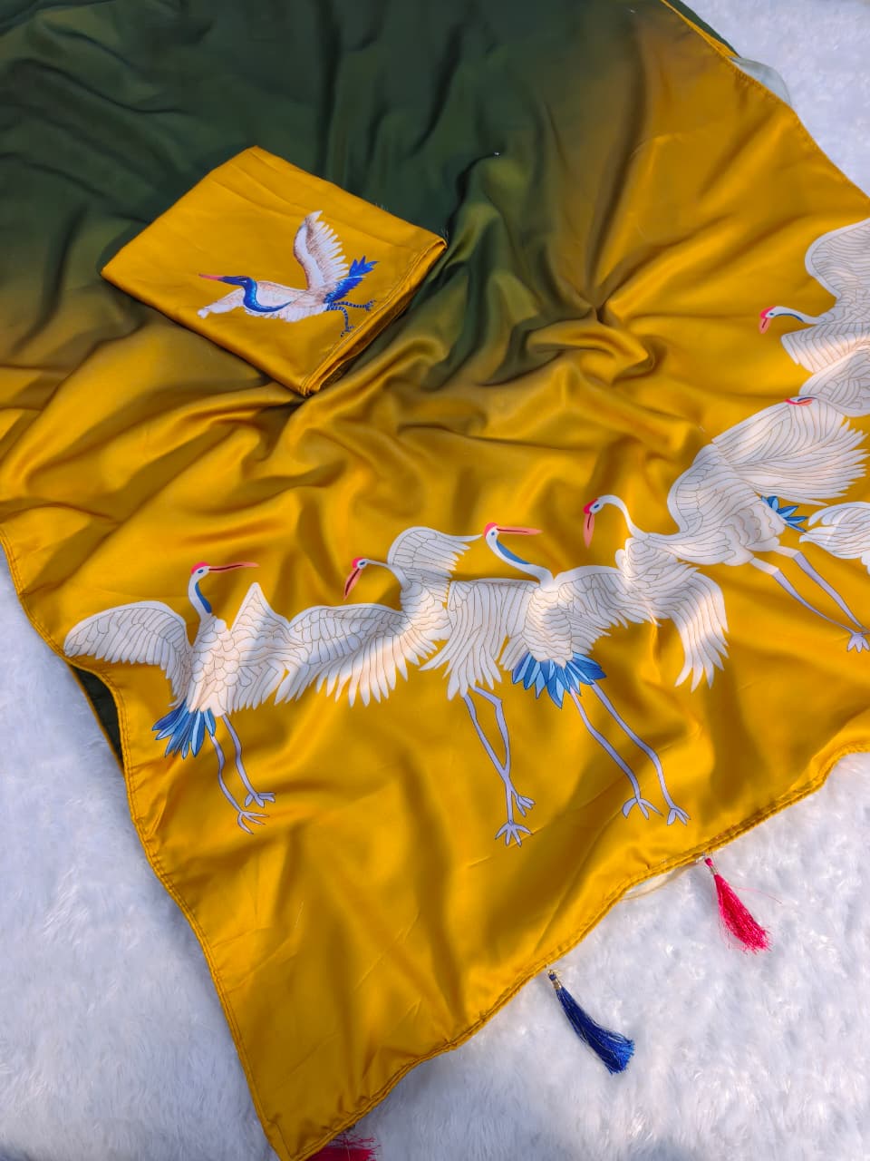 crepe silk saree with swan multiwork look digital print all over sarees attached with perfectly matched pallu & blouse peice with piping work and tussels
