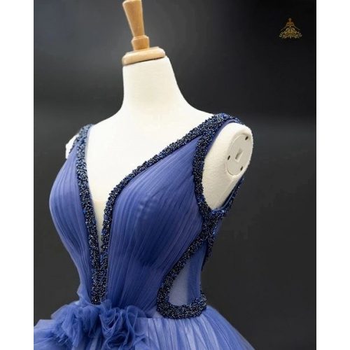This tulle prom dress will supplement charm to your beauty beautifully. It is specially designed to make you look unique and stylish among the rest. The rich contrast of dark blue and champagne color is vibrant and exciting. This silhouette is based on winning gown style to let you make a bold statement on special events. You will be looking pretty gorgeous in this dress. This dress attribute has a sleeveless and backless style. Its deep plunging neck design will impress your viewers. The exquisite elaboration of beads is just extraordinary and surpassing its charms. Back up lace style lets you adjust this dress with your bodice shape to make it tempting and appealing.
