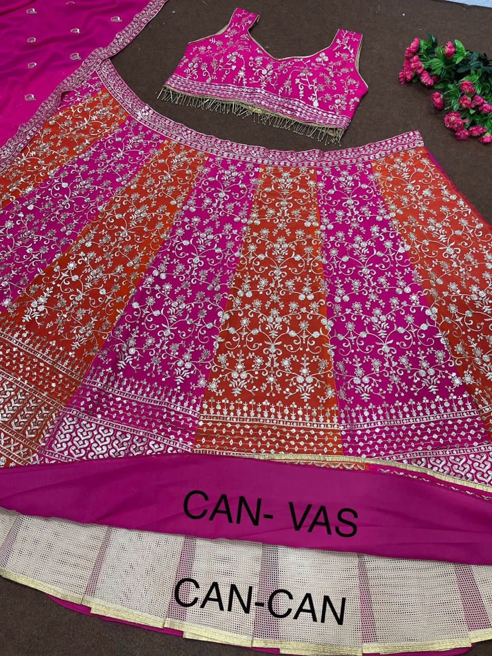 LEHENGAS WORK : HEAVY EMBROIDERED SEQUNCE WORK WITH 3 MTR FLAIR CAN-VAS, CAN- CAN