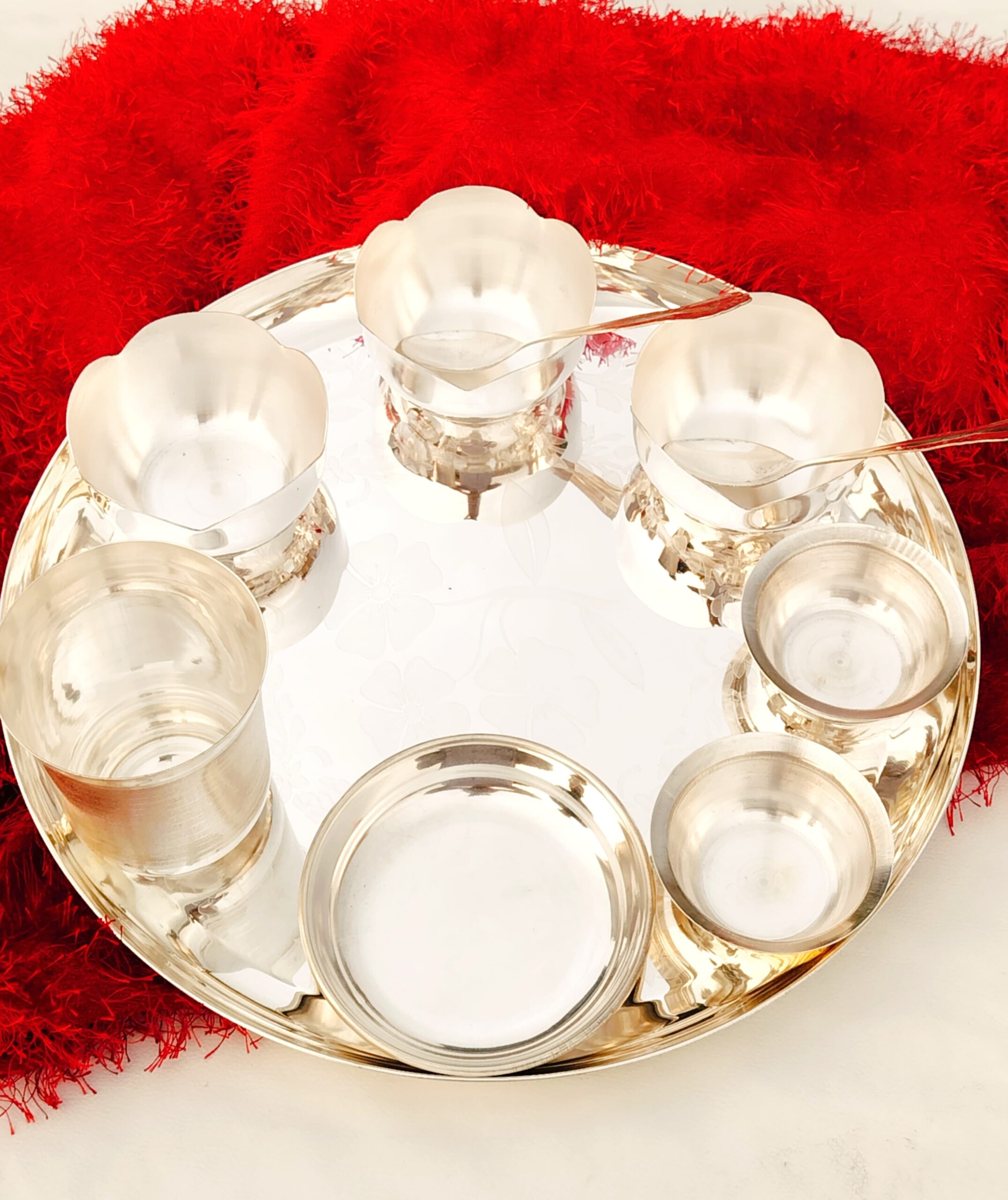 German silver big size flower engraved Dinner set/ bhojan thali set with lotus shape bowl
