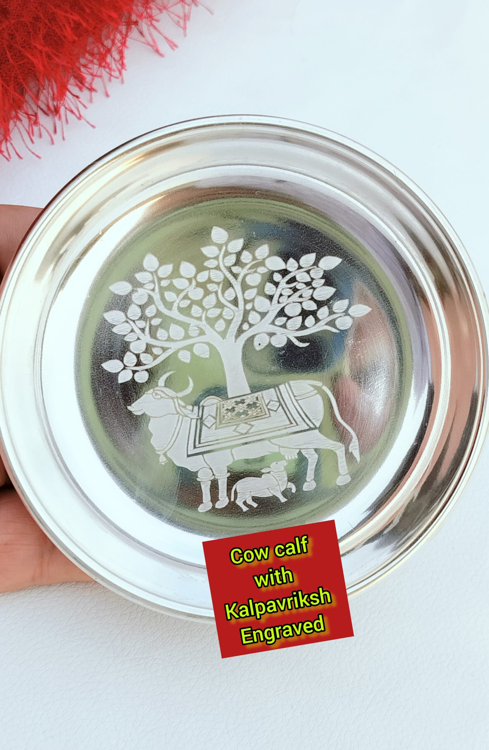 German silver big size 5″ inch hand engraved cow calf with kalpavriksh design engraved plate