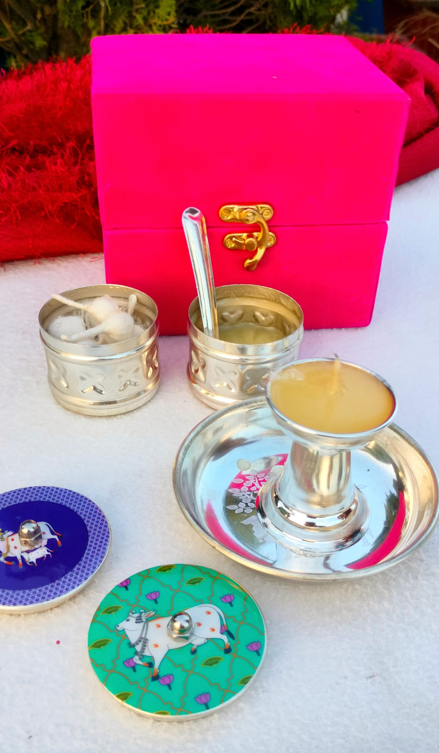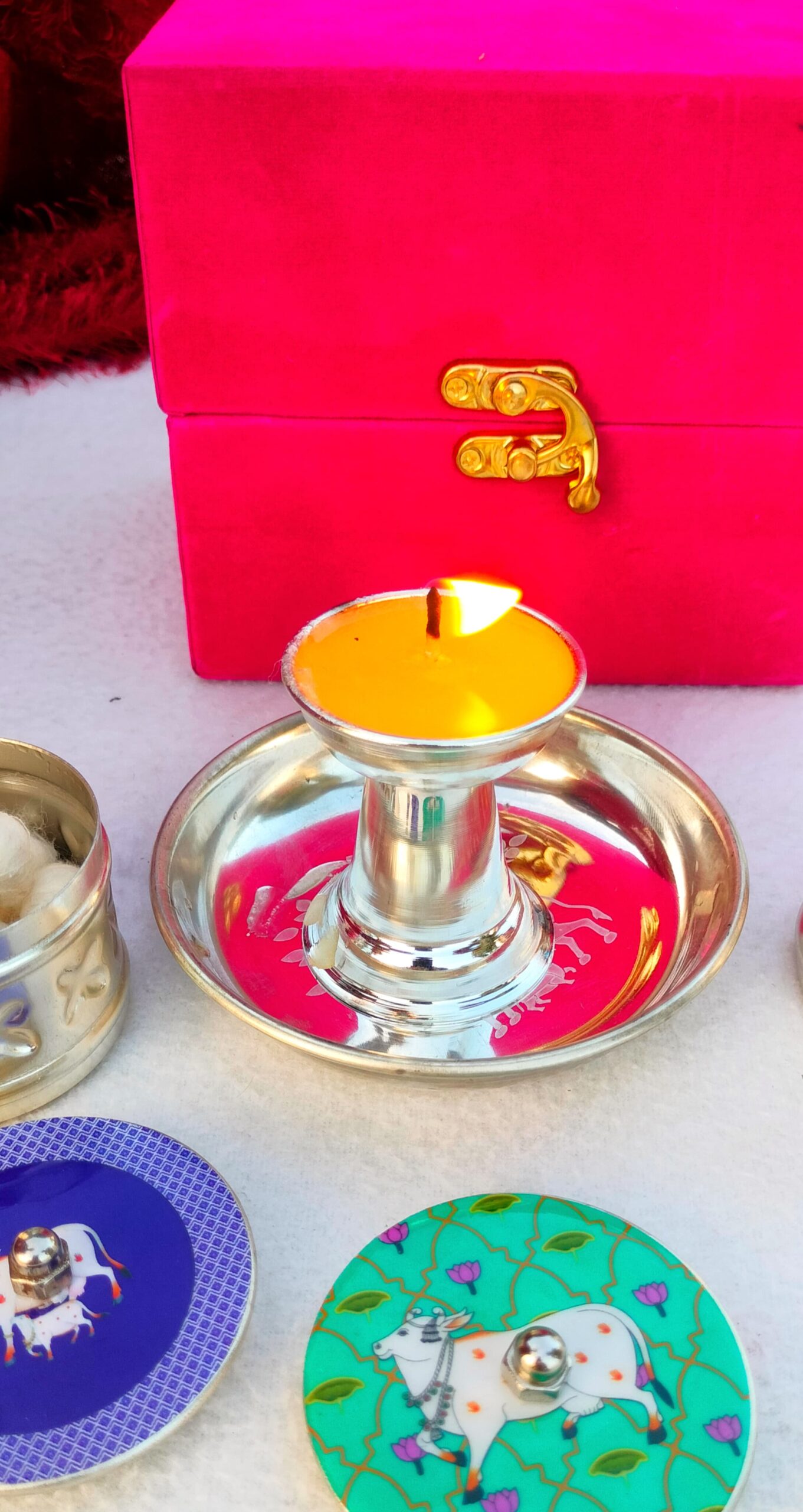 1. German silver daily use Ghee + batti (cotton wicks) dibbi with diya plate set