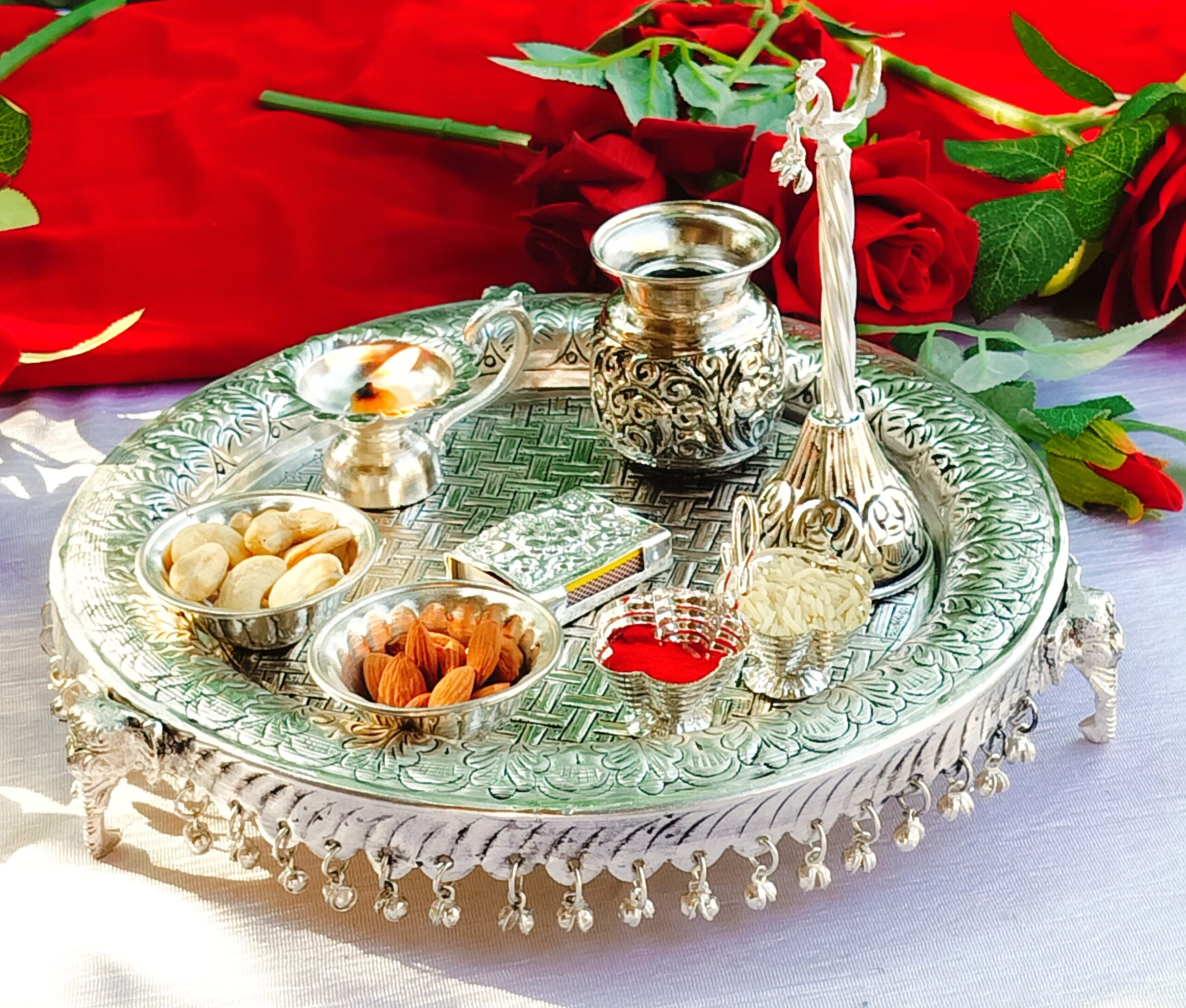 German silver elephant design nakkashi aarti thali set