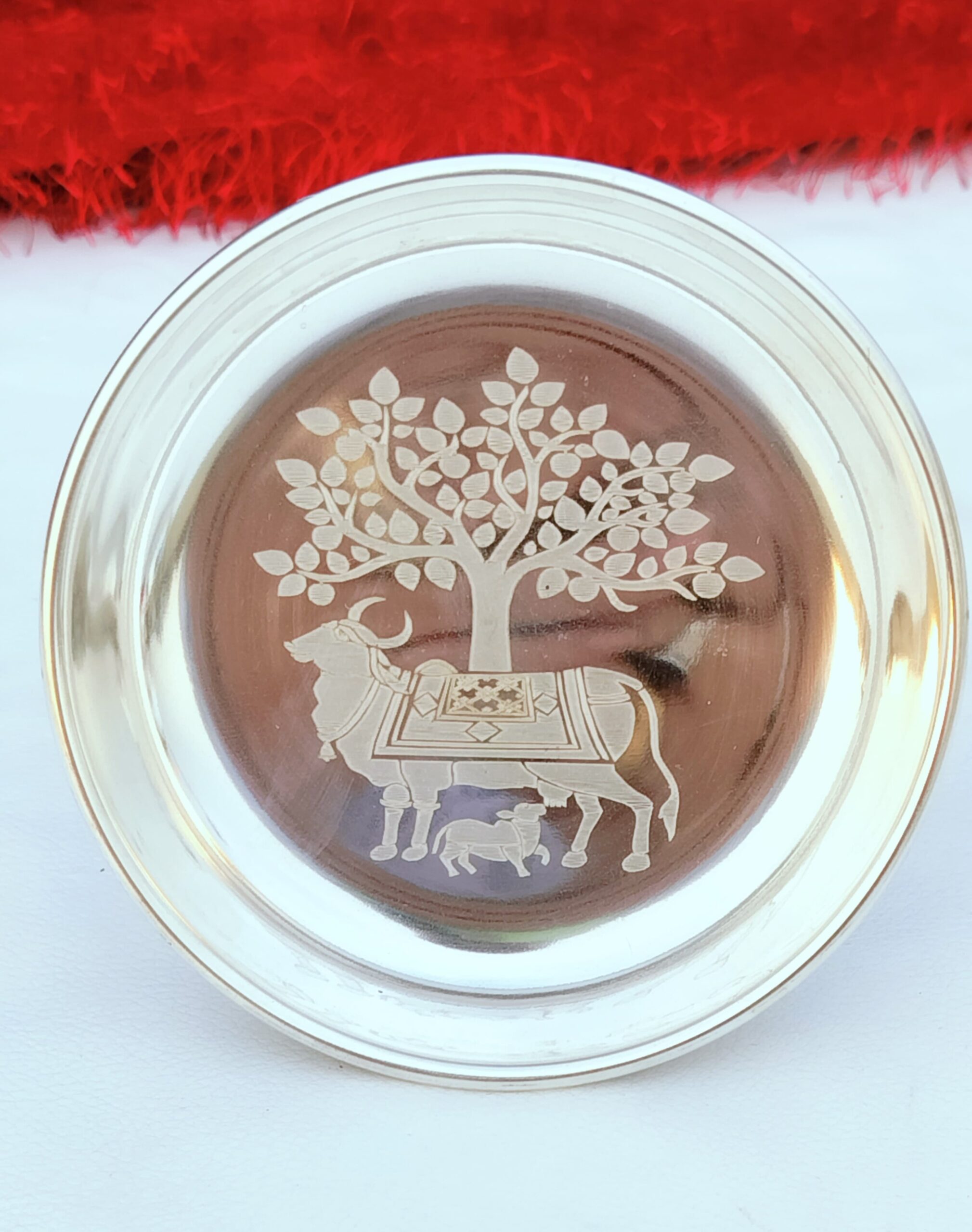 German silver hand engraved cow calf with kalpavriksh design plate