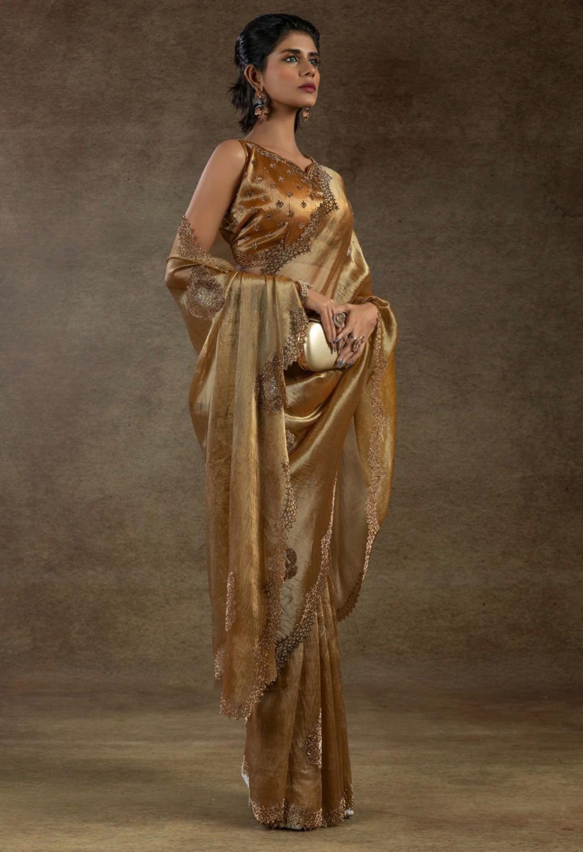 A moment in time. Like a million starts in the sublime sky, delicately handcrafted Diamond work bring out the vibrancy of this pink silk saree.