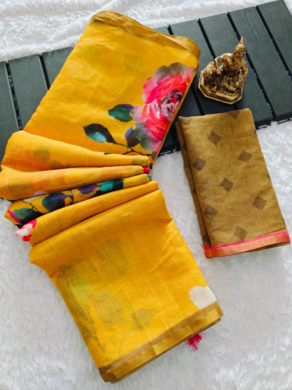 Saree Fabric: Heavy linen blooming saree floral digital print on allover saree attached with heavy motif Tussels and gold border with PERFECTLY MATCHED blouse piece and pallu