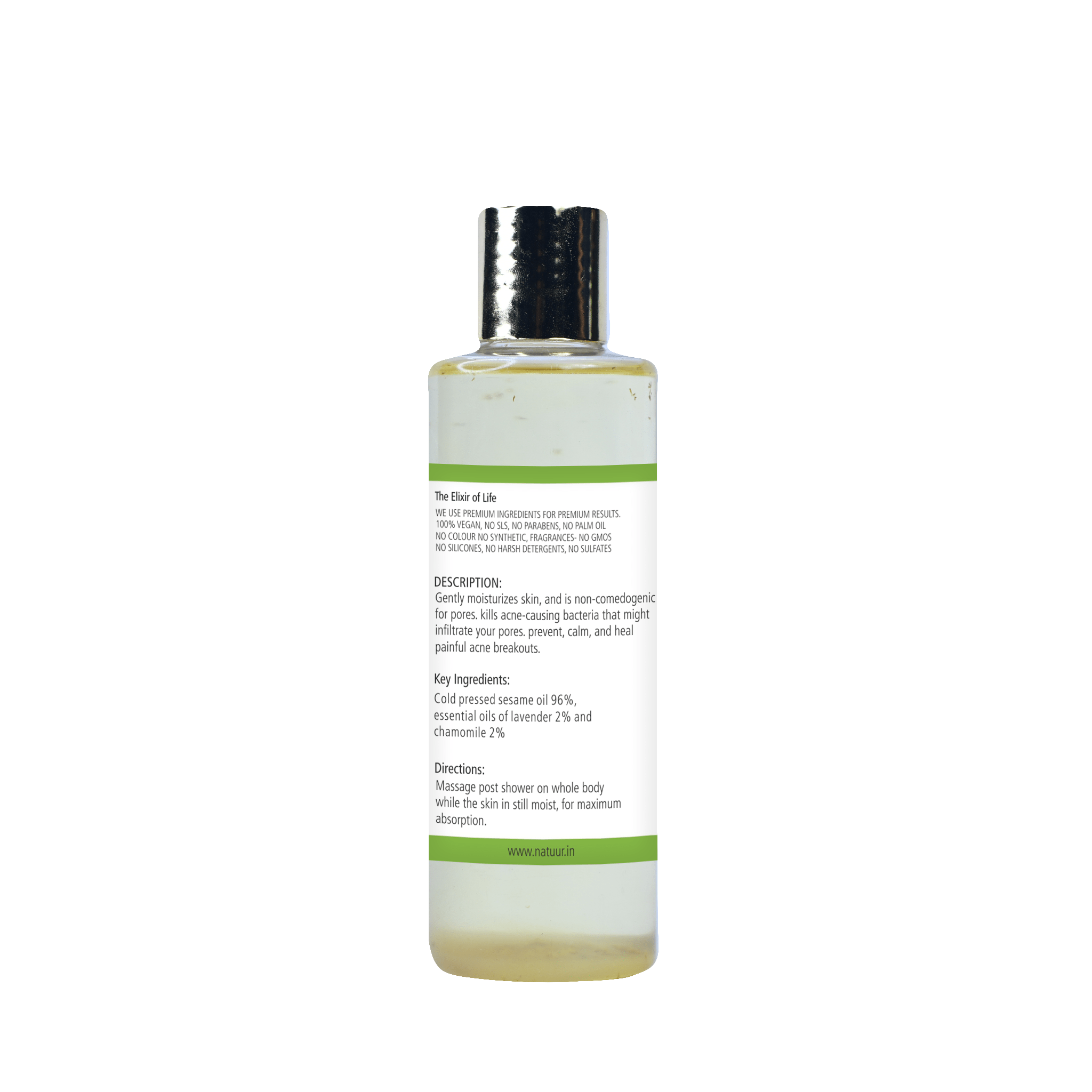 - Natuur’s Lavender Chamomile Body Massage Oil is the perfect way to soothe and nourish sensitive skin, with natural and gentle ingredients like cold-pressed sesame oil, , lavender and chamomile essential oils.
