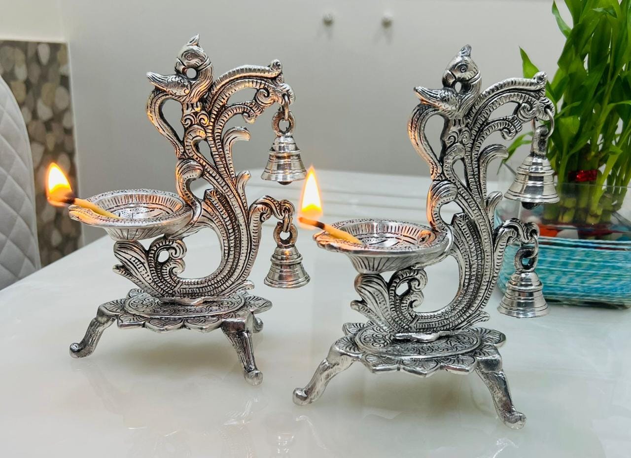 German Silver Hand Engraved Peacock Diya With Bells(Set of 2)