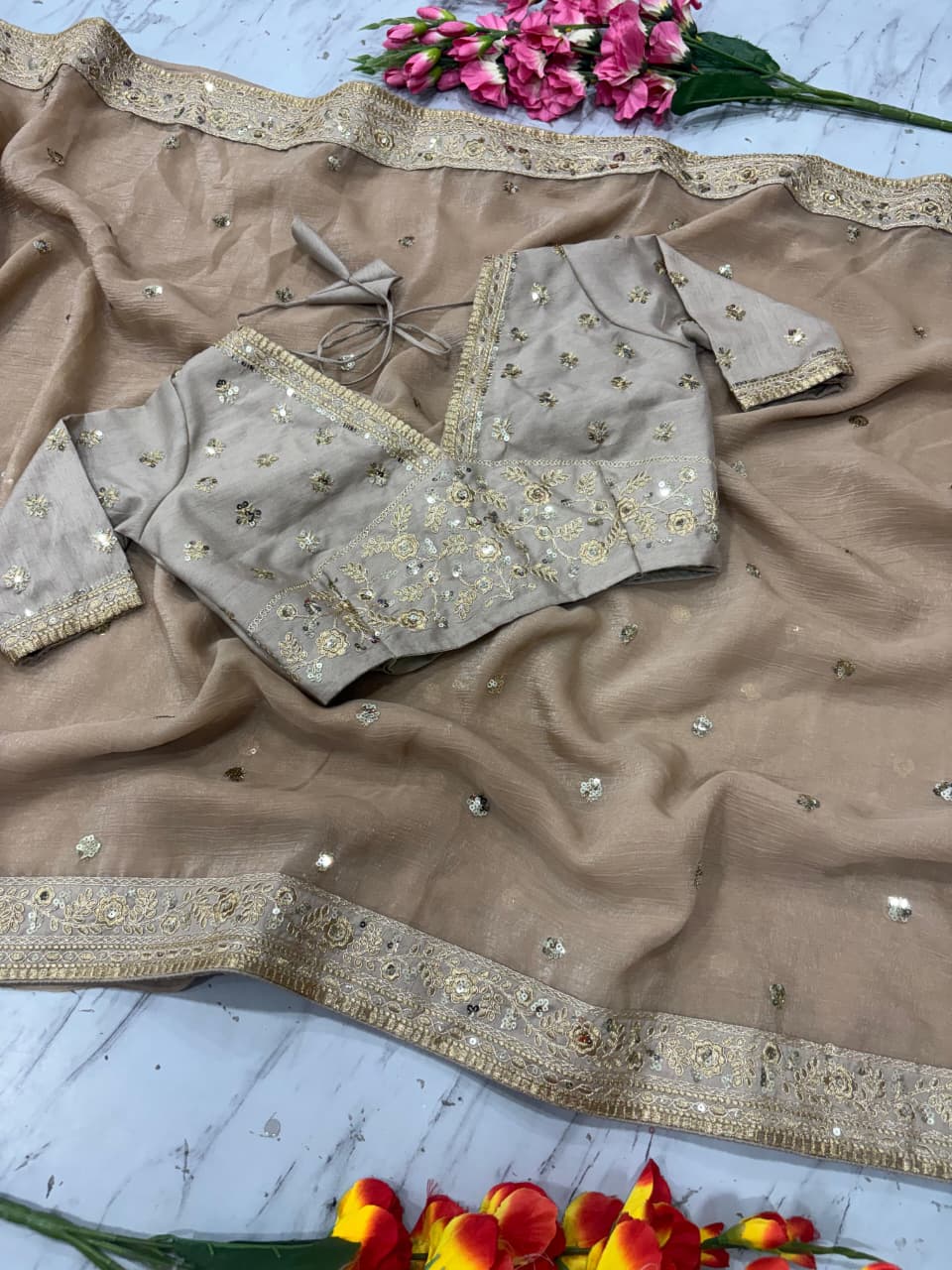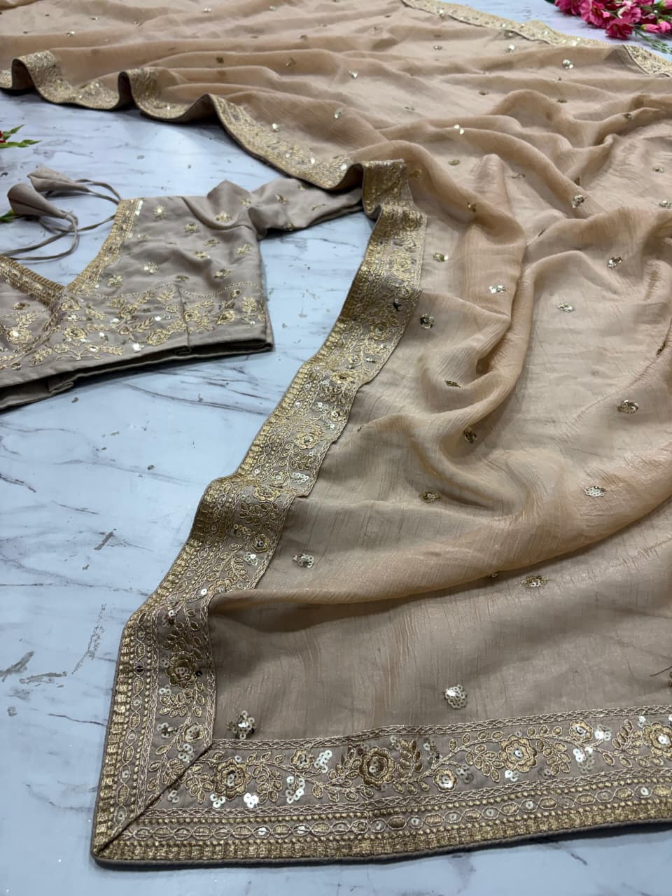 Saree : Premium Gold Crush Saree Embellished With Beautiful Sequins Work And Coding Work