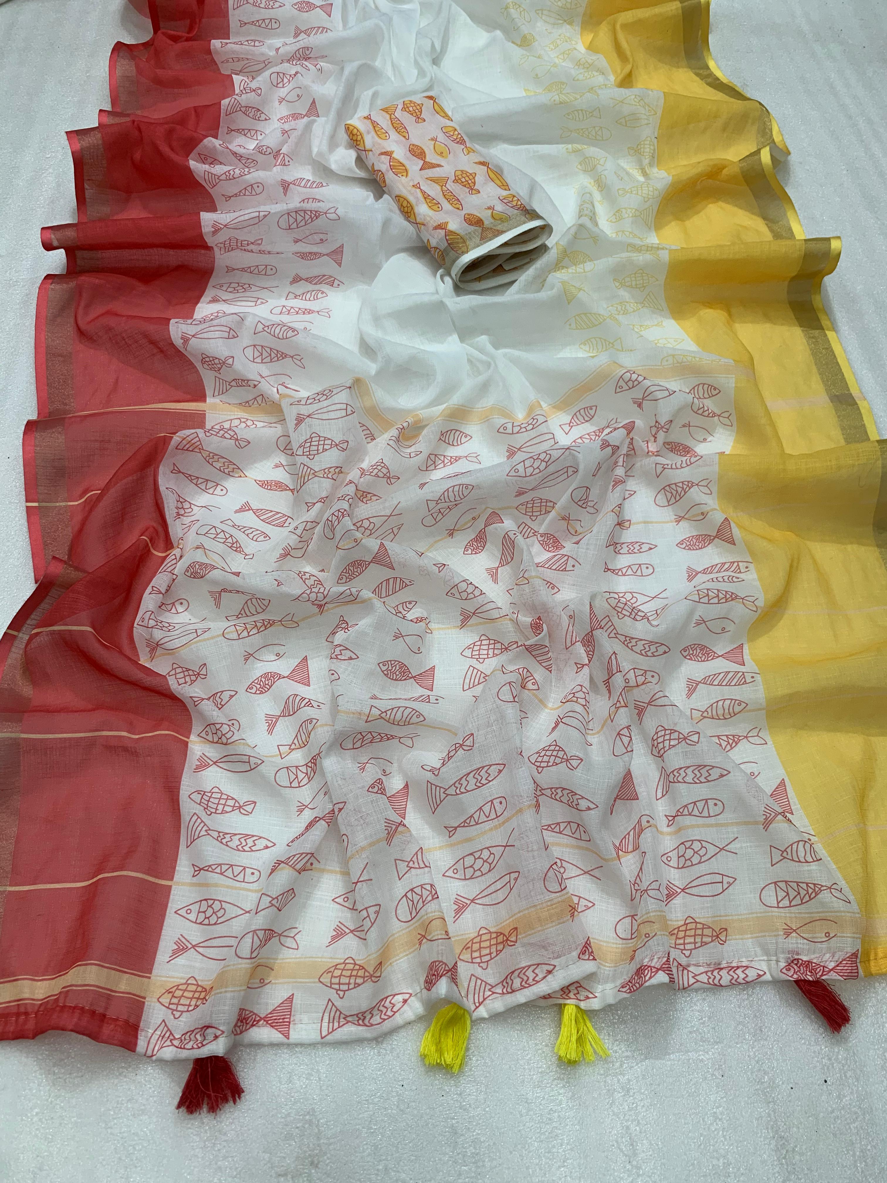 Pure Linen Chanderi Saree With Golden Zari border with beautiful latkan