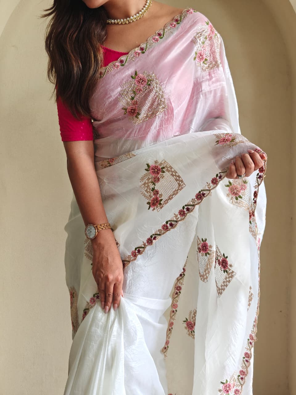 Pure paper silk crush saree with beautiful floral embroidery all over the saree . It also has Swarovski work on the buttas. With very beautiful cutwork border