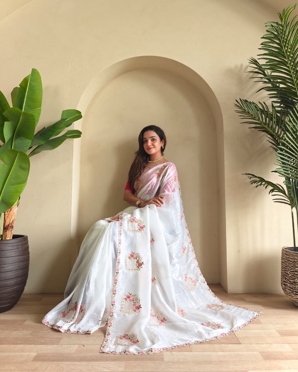 Pure paper silk crush saree with floral embroidery