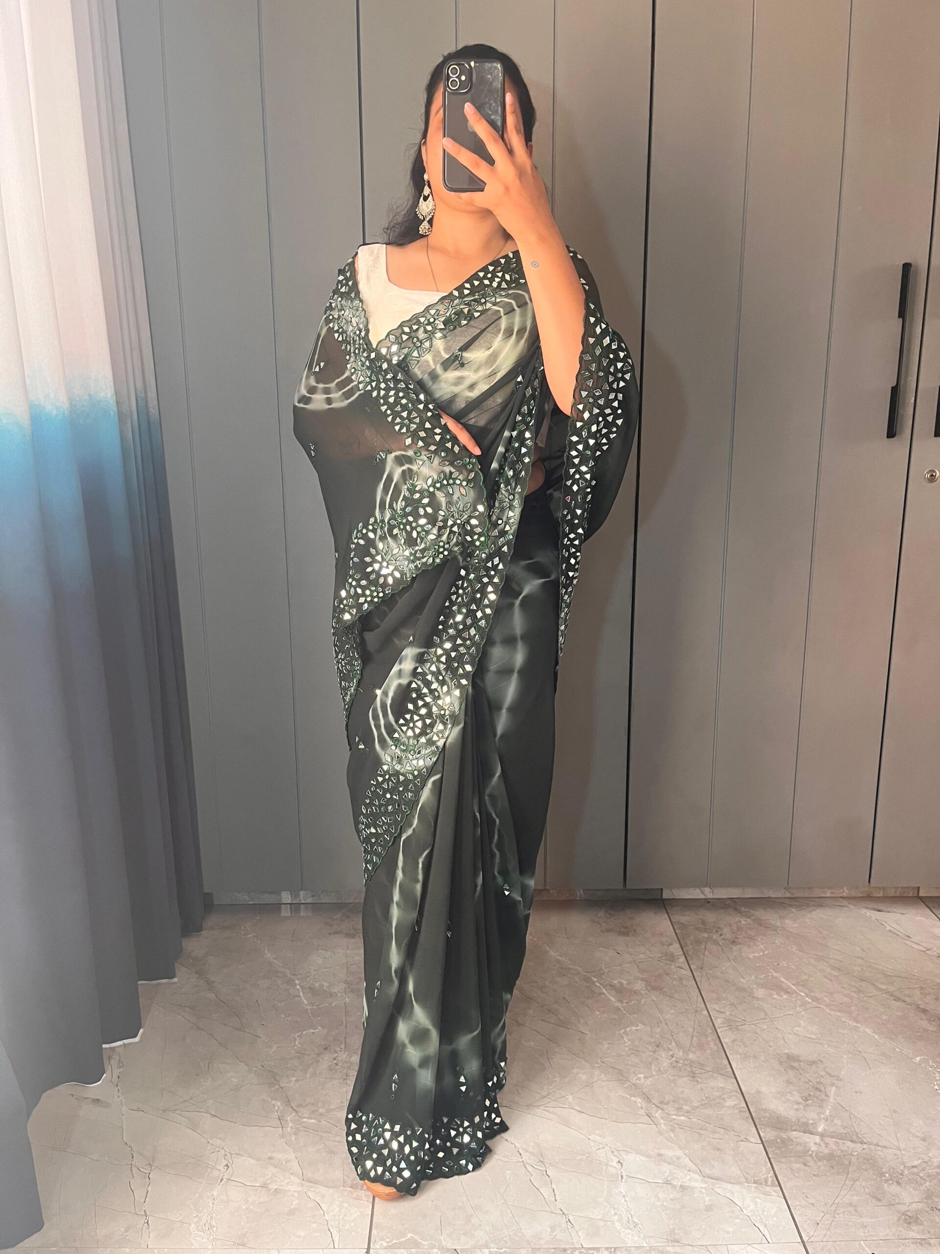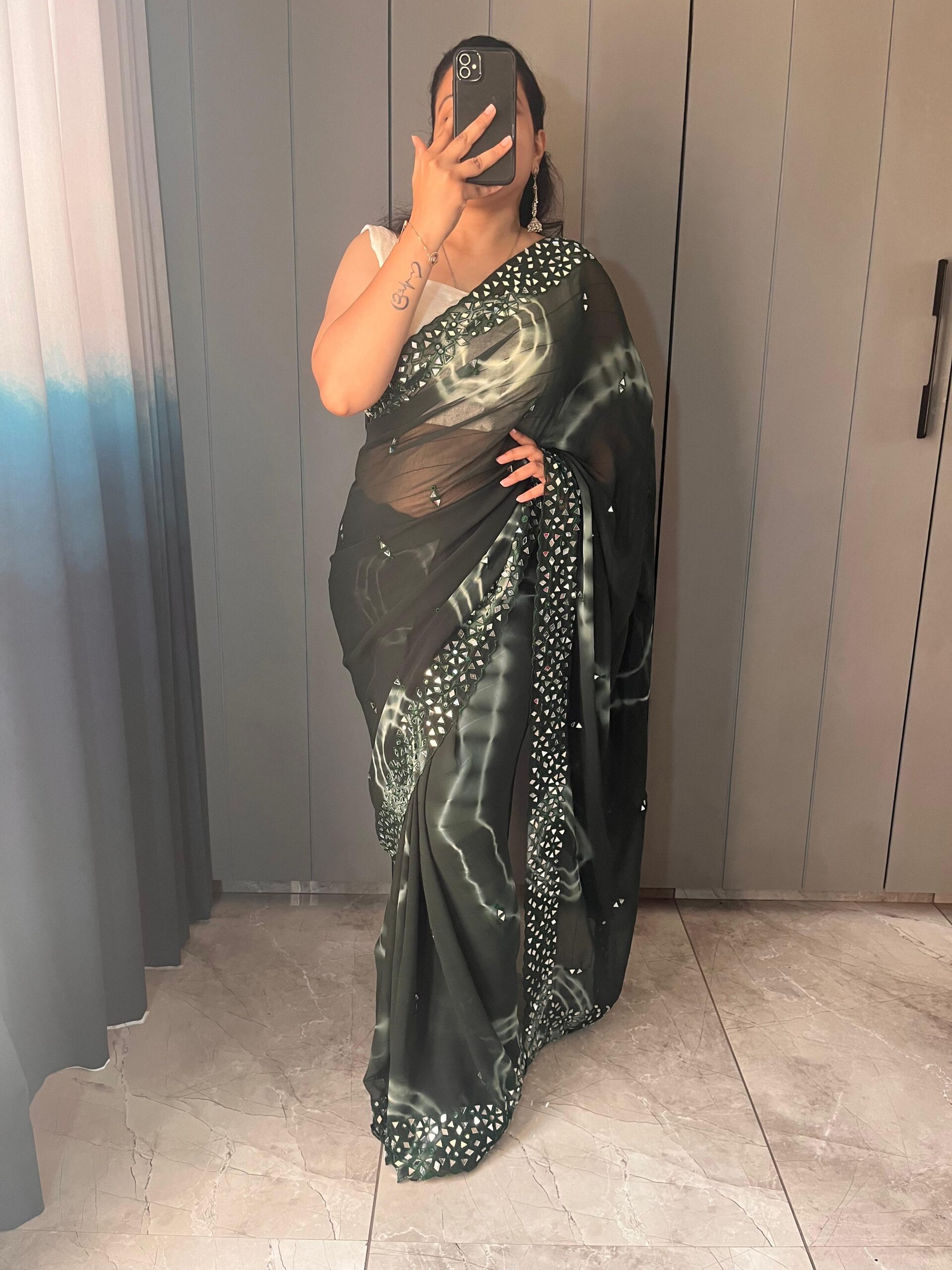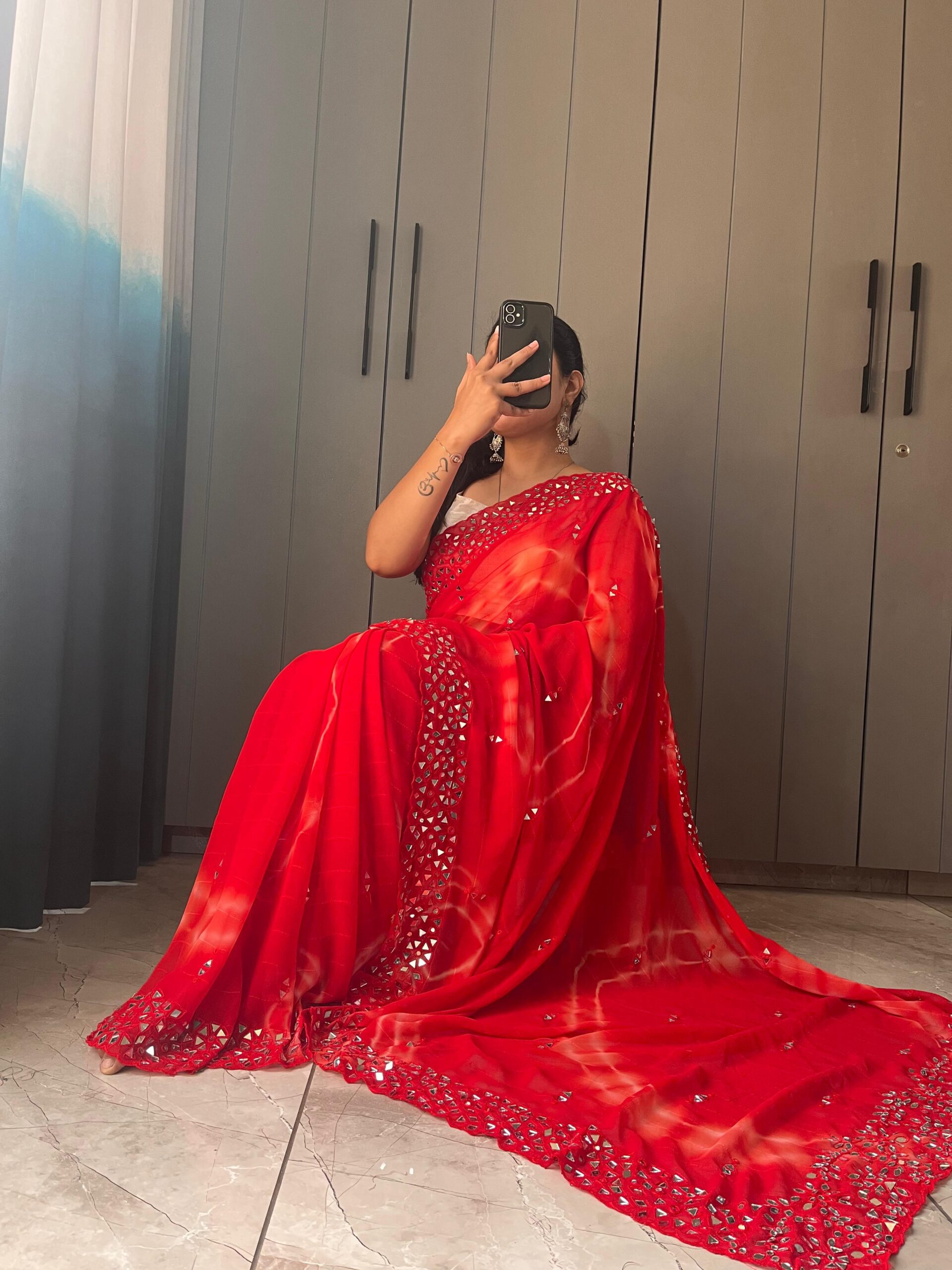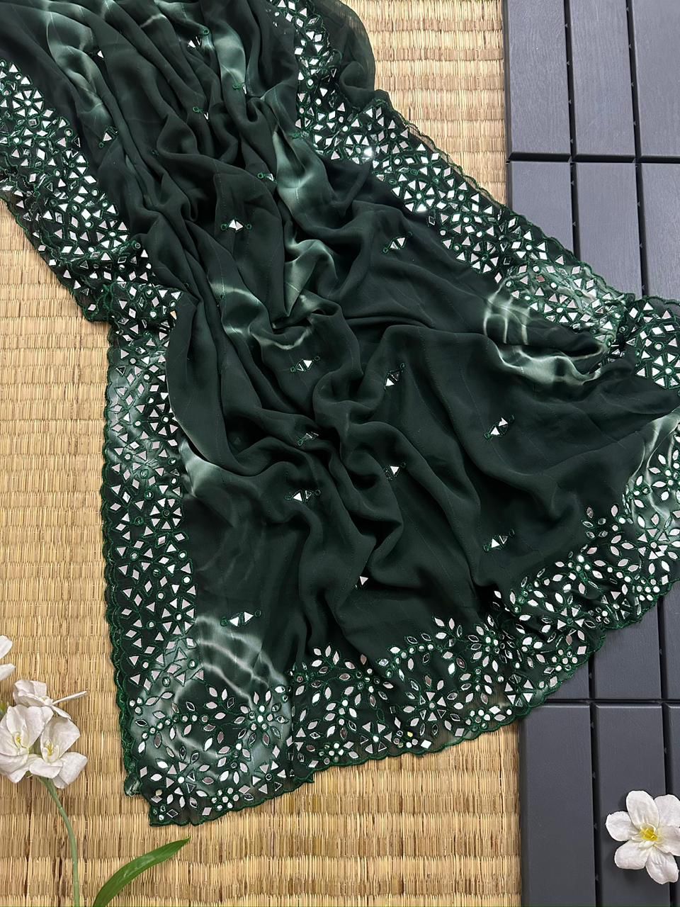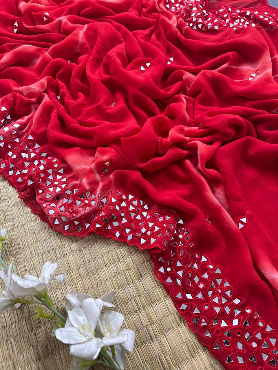 Pure soft chiffon sibori printed saree with embroidery work border with real mirror attached in saree