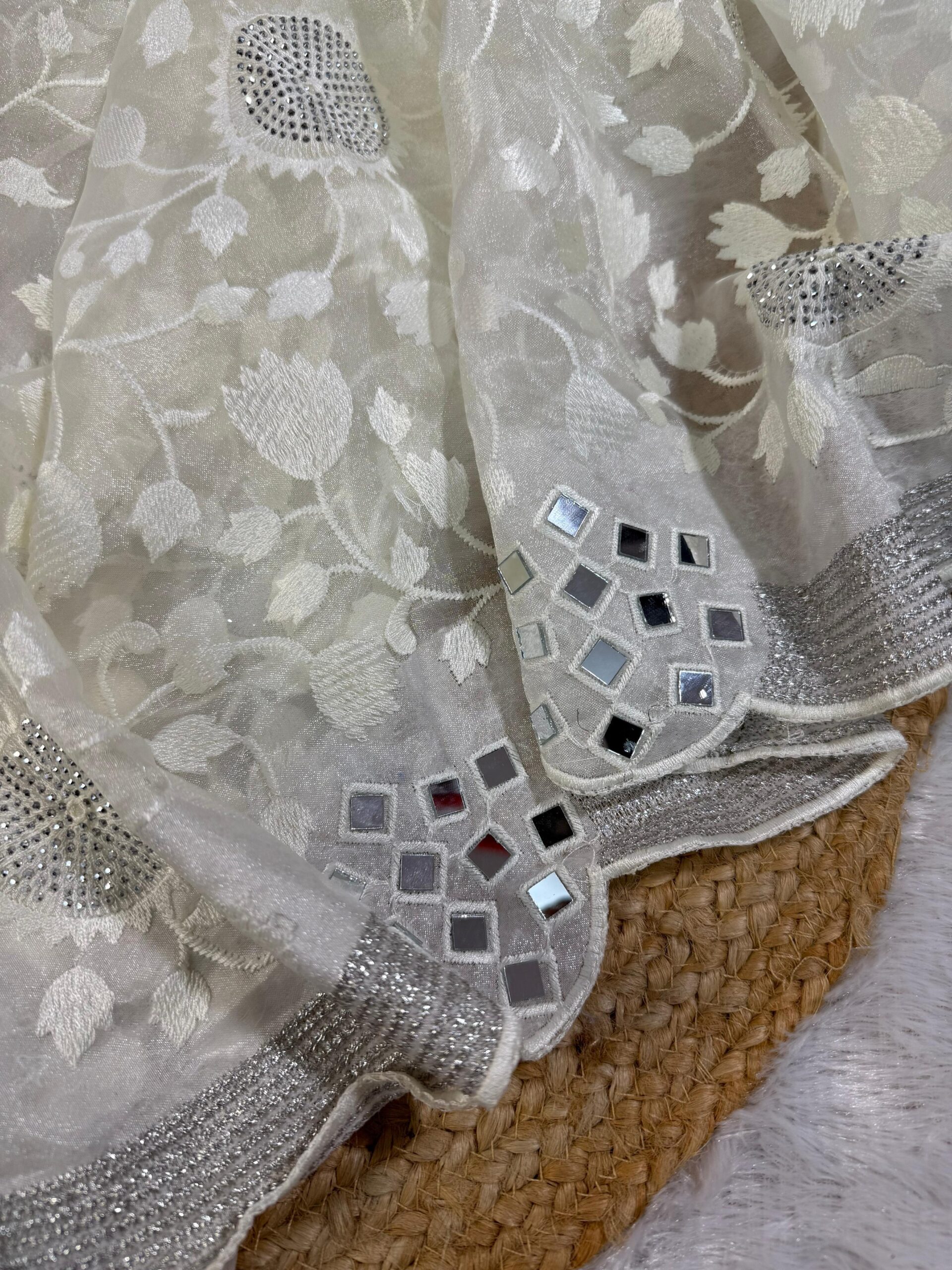 Introducing our exquisite Organza Saree – a perfect blend of tradition and sparkle! Crafted in rich organza fabric, this beauty features intricate thread zaal work with elegant Siroski embellishments, finished with a silver zari border for that extra luxe touch. Highlighting the elegance is the original mirror work scattered gracefully across the saree. Comes paired with a contrasting gold silk blouse to complete the look