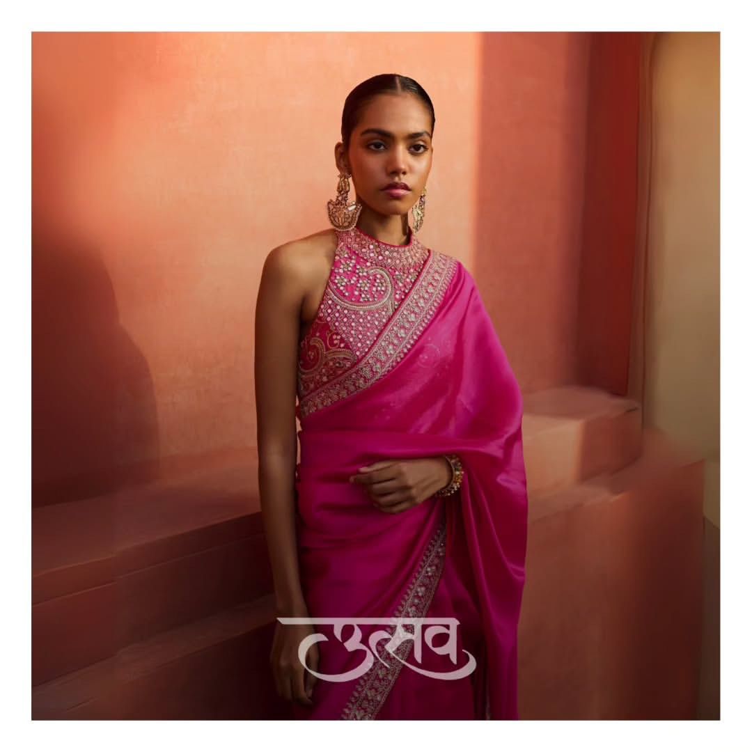 A moment in time. Like a million starts in the sublime sky, delicately handcrafted sequins work bring out the vibrancy of this Bengani silk saree.