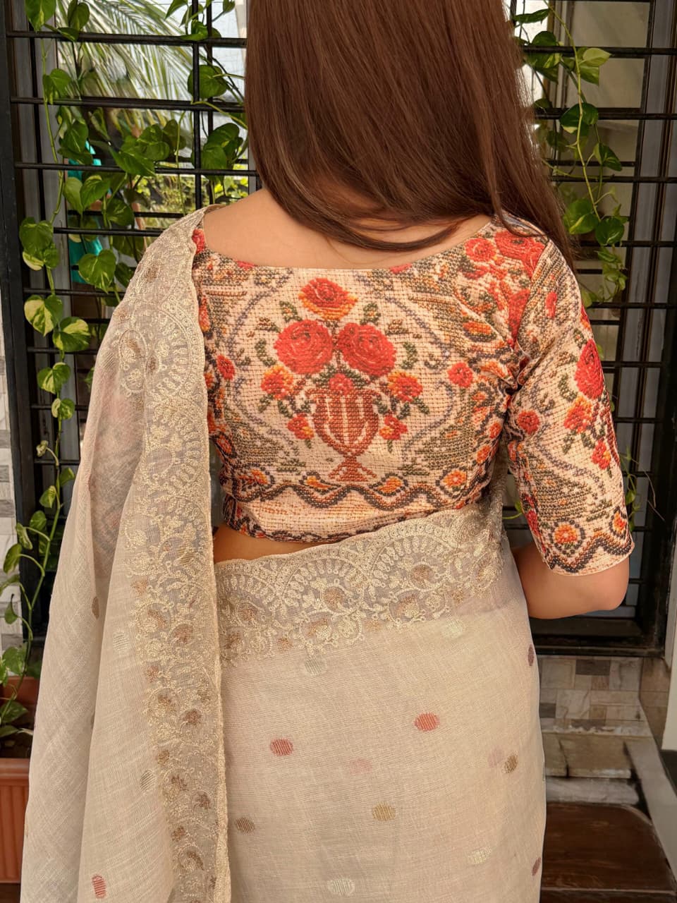 This linen saree, adorned with intricate embroidered with combination of Digital print blouse, is a dreamy blend of grace, luxury, and timeless charm