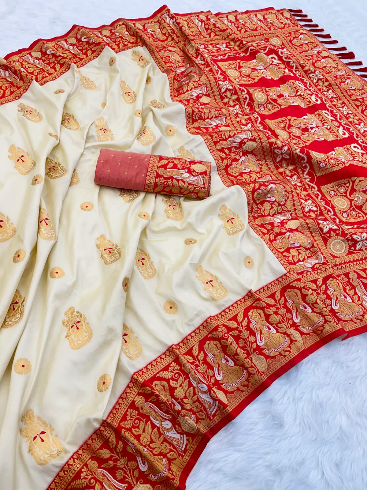 Soft Silk Sarees with woven meenakari motifs all over the body having Rich woven red contrast pallu and contrast zari woven meenakari red border paired with brocade contrast blouse