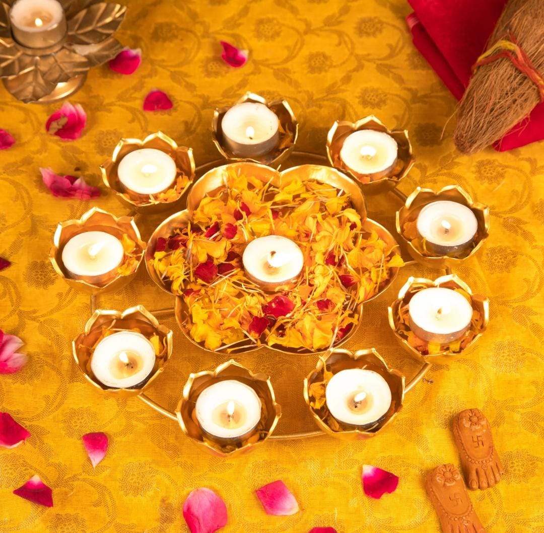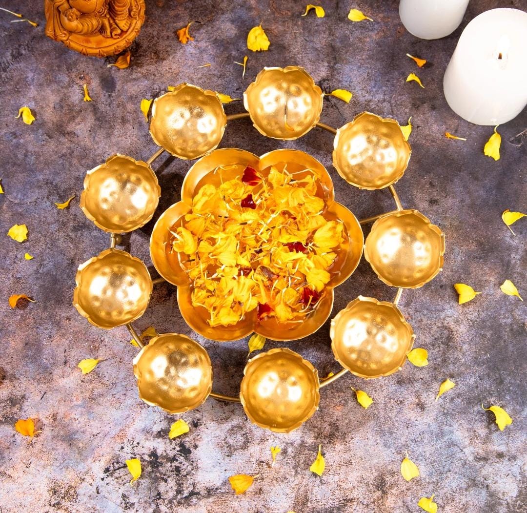 T-light stand can be placed in multiple corners of your house to help lighten up that area with bright Diya lights and also with positive energy. It has mini flower shaped tealight stands placed on the structure on the outline and has a mini urli in the centre. It’s a small and petite decorative showpiece that will add charm to its surroundings, wherever placed.