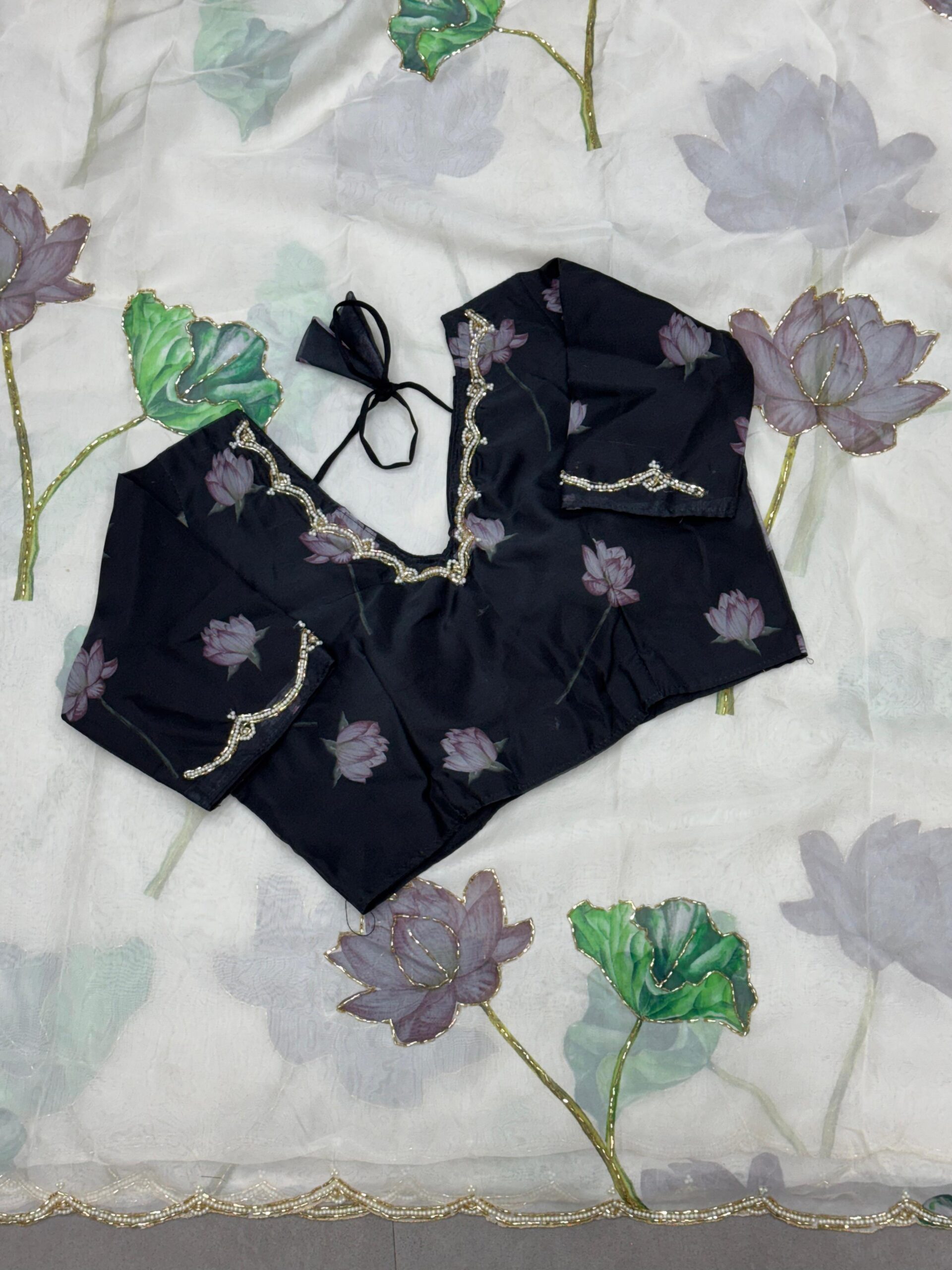Fabric:- soft teby organza silk saree with beautiful flower prints and hand work khatli border with cut dana touch up and aarco